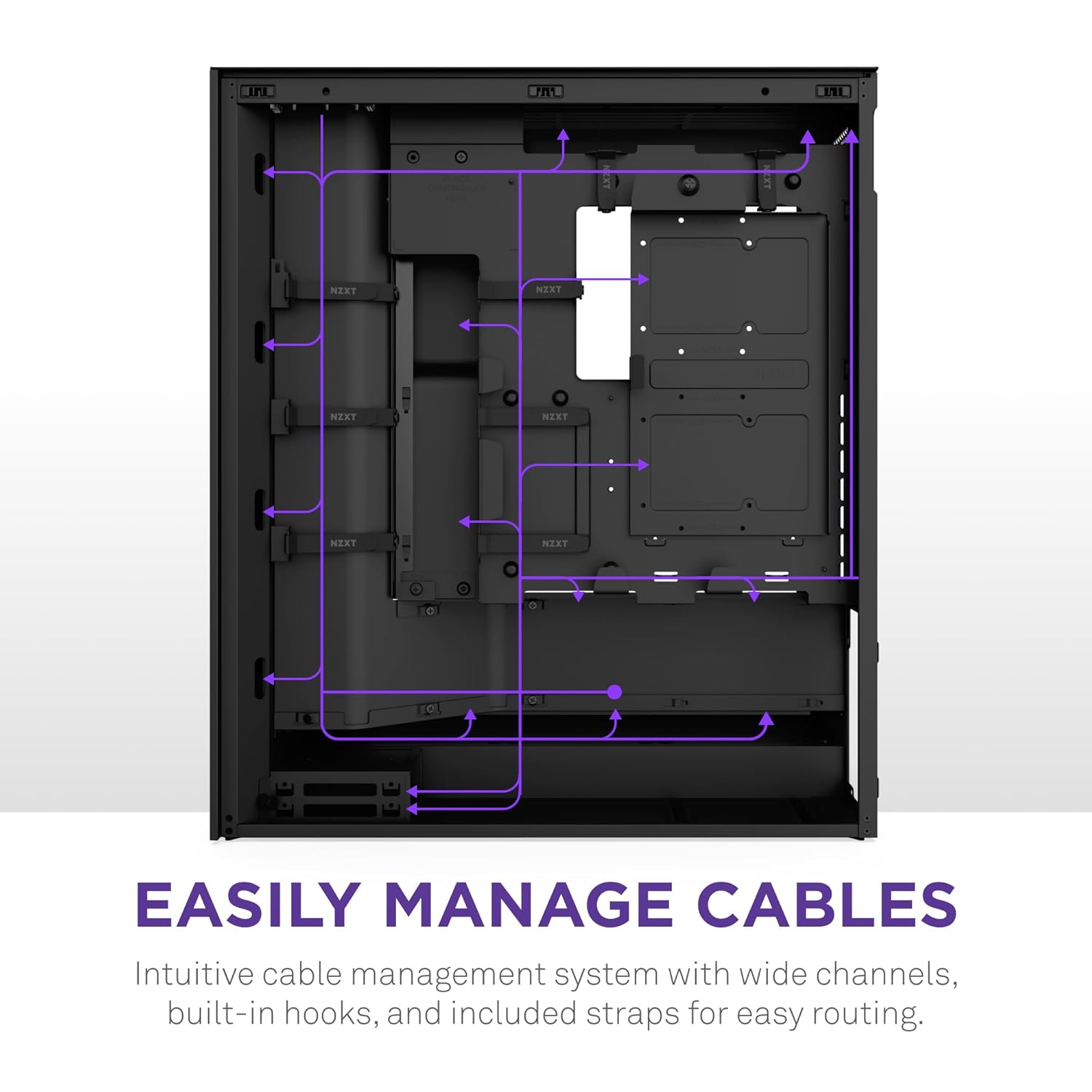 EASILY MANAGE CABLES — Intuitive cable management system with wide channels, built-in hooks, and included straps for easy routing.
