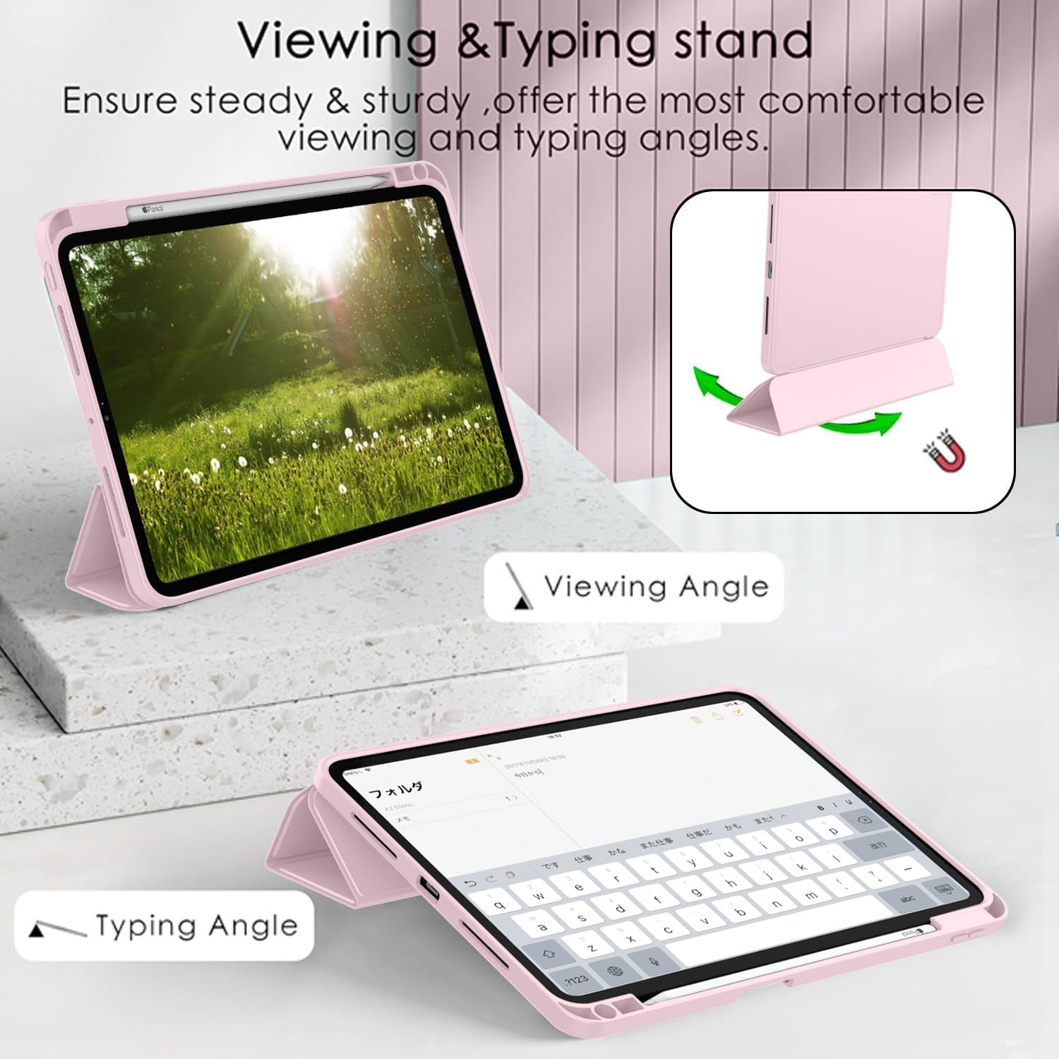 ✔️[𝐒𝐭𝐚𝐛𝐥𝐞 𝐓𝐫𝐢-𝐟𝐨𝐥𝐝 𝐒𝐭𝐚𝐧𝐝] – The tri-fold front cover can support iPad in two standing position for viewing and typing witch offers you extremely comfortable viewing experience , no matter watching videos or drawing in school.