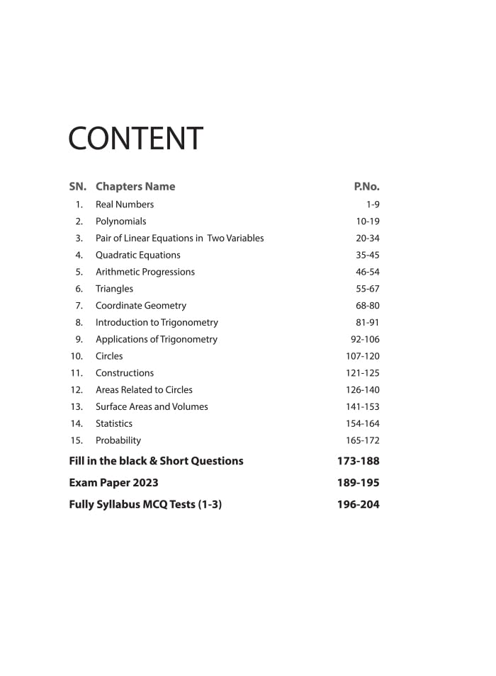 Real Numbers, Polynomials, Pair of Linear Equations in Two Variables, Quadratic Equations, Arithmetic Progressions, Triangles, Coordinate Geometry, Introduction to Trigonometry, Applications of Trigonometry, Circles, Constructions, Areas Related to Circles, Surface Areas and Volumes, Statistics, Probability, Fill in the Blank & Short Questions, Exam Paper 2023, Fully Syllabus MCQ Tests (1-3)