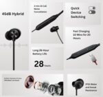 Experience superior sound and comfort with these advanced wireless earphones featuring powerful 45dB Hybrid Active Noise Cancellation. The 12.4mm dynamic drivers deliver rich, bombastic bass and crystal-clear audio across frequencies. Enjoy remarkable battery life with up to 28 hours of total playback time, and quick charging that provides 20 hours of music with just 10 minutes of charging. The earphones come equipped with 3-mic AI call noise cancellation for crystal clear conversations. Built with IP55 water and sweat resistance, these earphones are perfect for workouts and outdoor activities. The quick device switching feature allows seamless transitions between connected devices. The ergonomic in-ear design ensures a comfortable fit for extended listening sessions. With USB Type-C connectivity and inline controls, these earphones offer convenient operation for music playback and calls. The sleek Booming Black finish adds a touch of sophistication to these feature-packed wireless earphones.