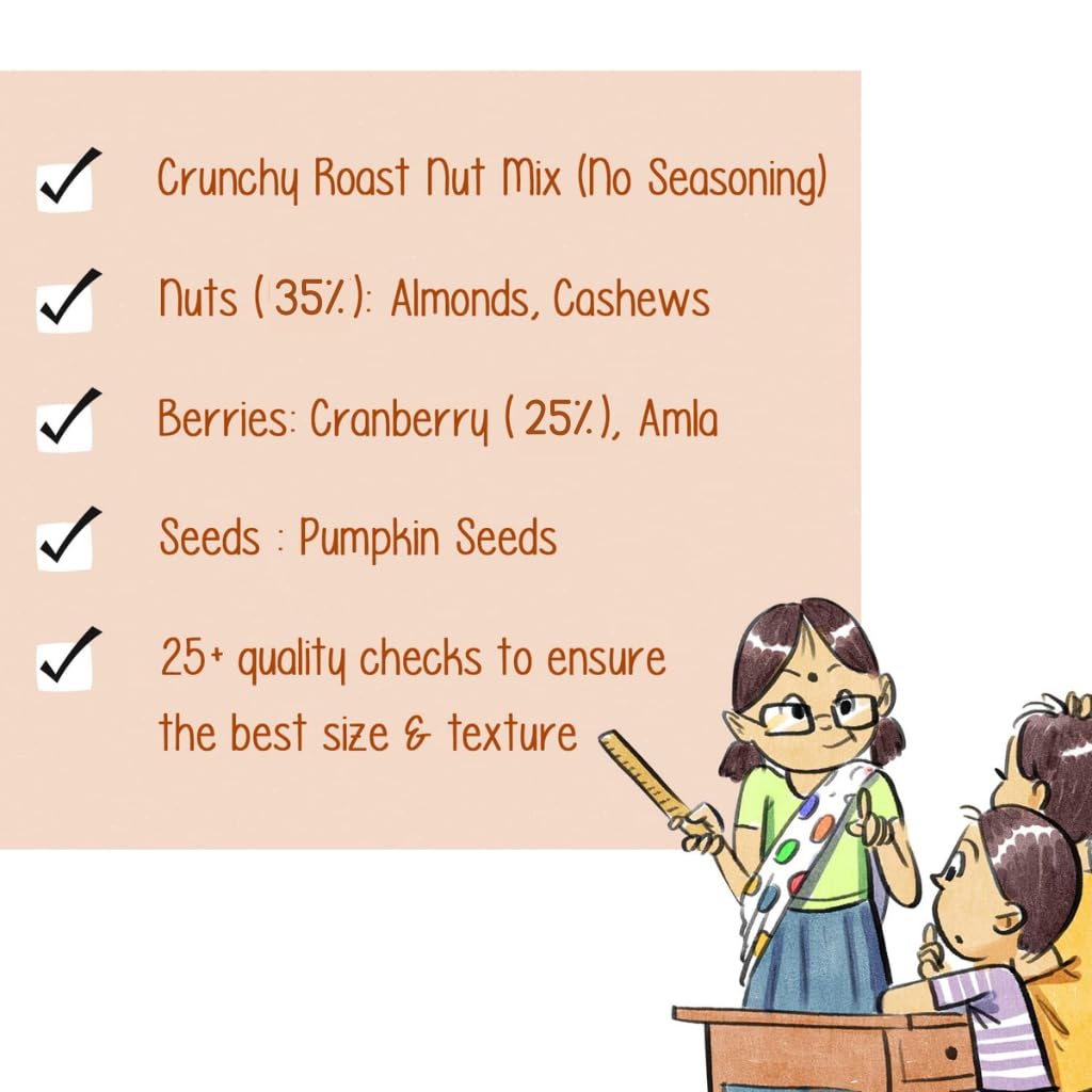 SUPER MIX SUPER TEAM: This snack is packed with almonds and cashews, cranberries and amla for wellness and a dose of crunchy pumpkin for protein!