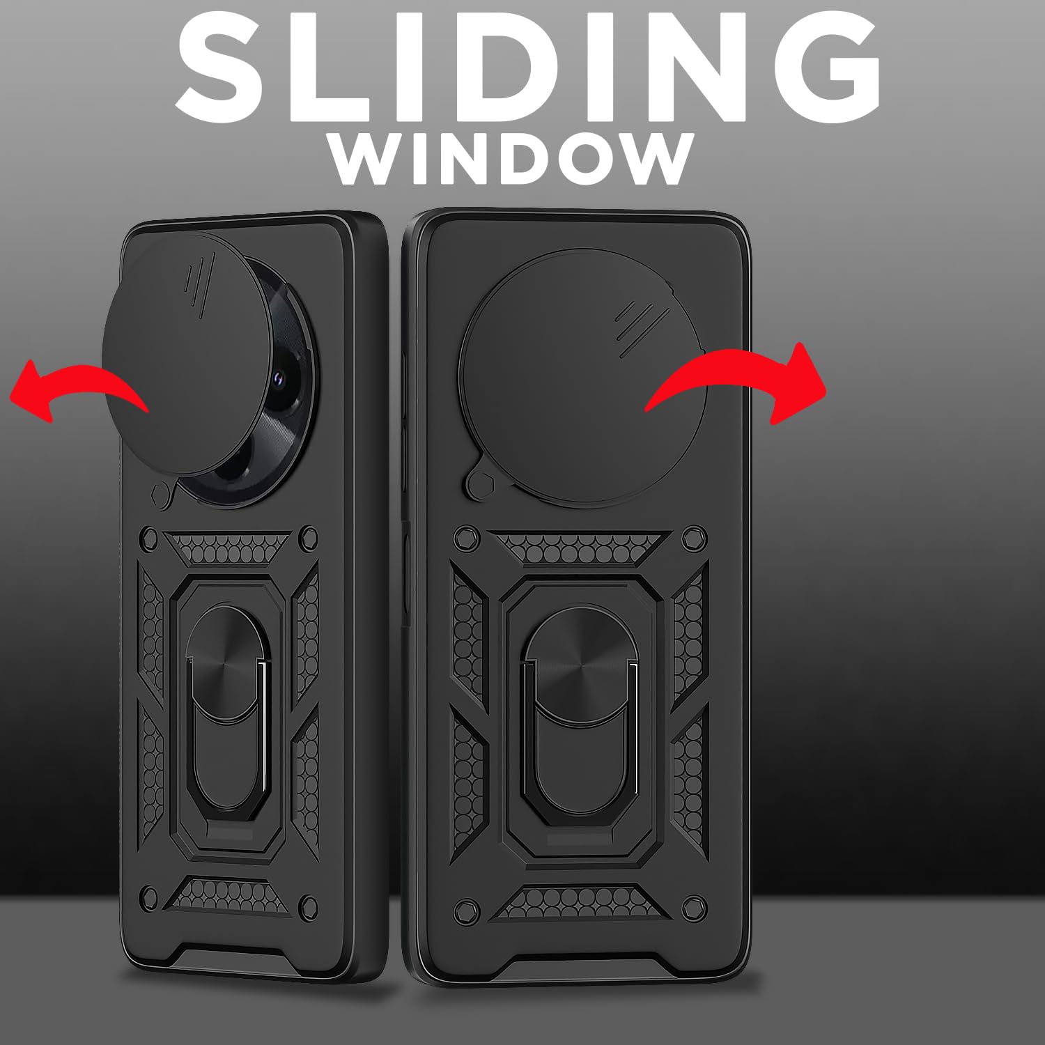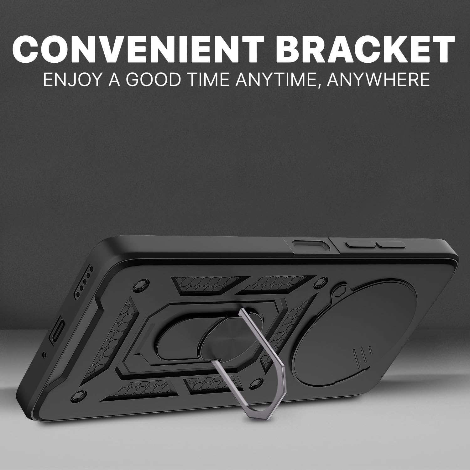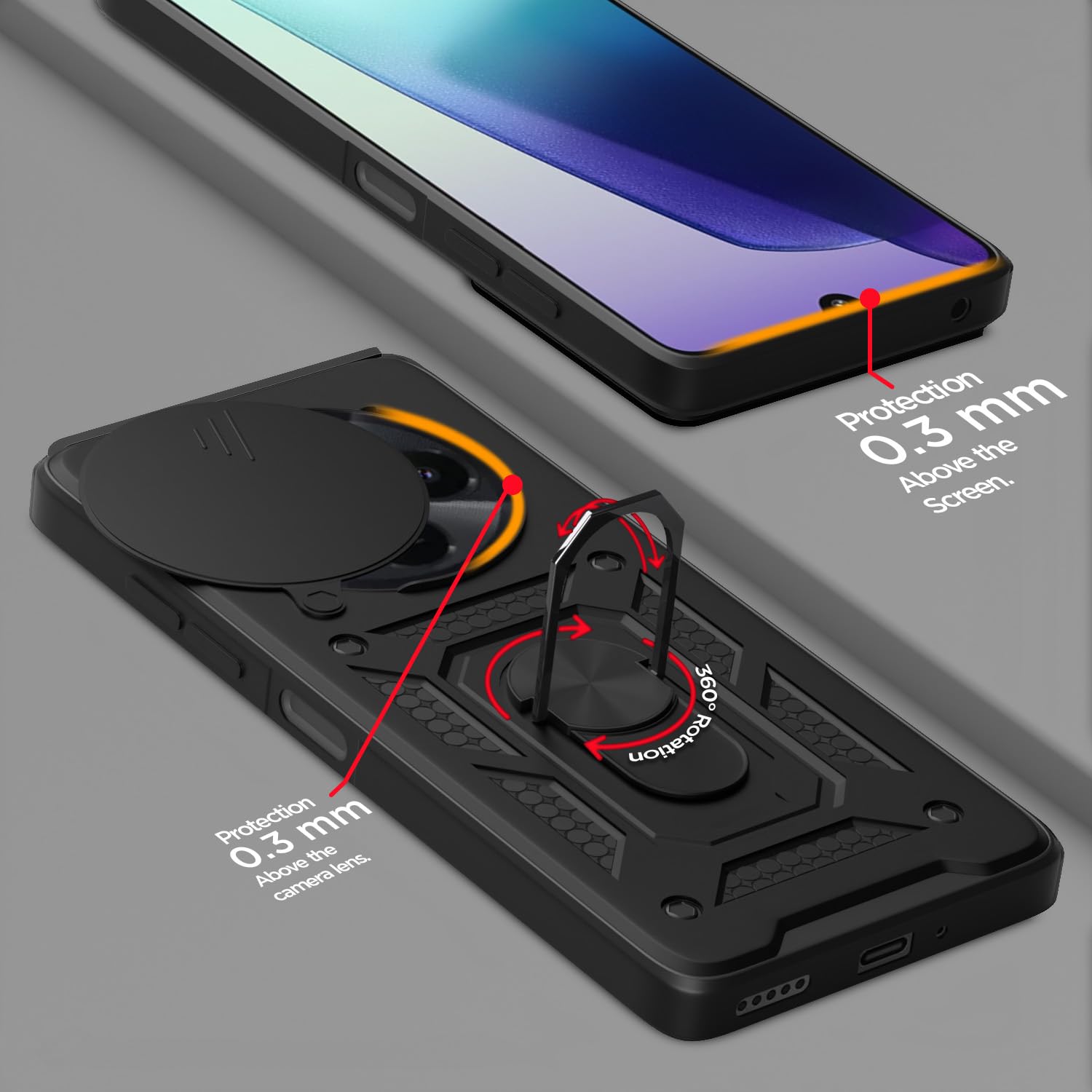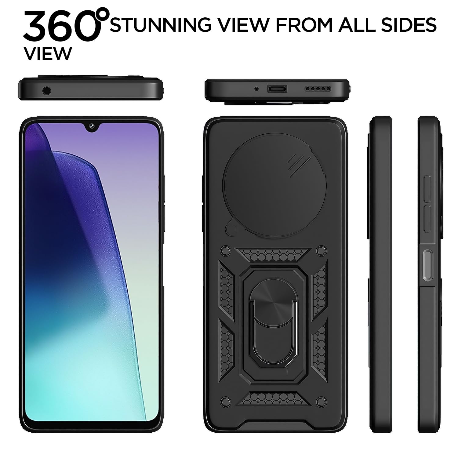 Pikkme D10 Tough Armor Back Cover | 360 Protection Case | Sliding Camera Shield Cover & Ring Holder Stand Bumper Case for Redmi A4 5G / Redmi 14C 5G / Poco C75 5G (Black)