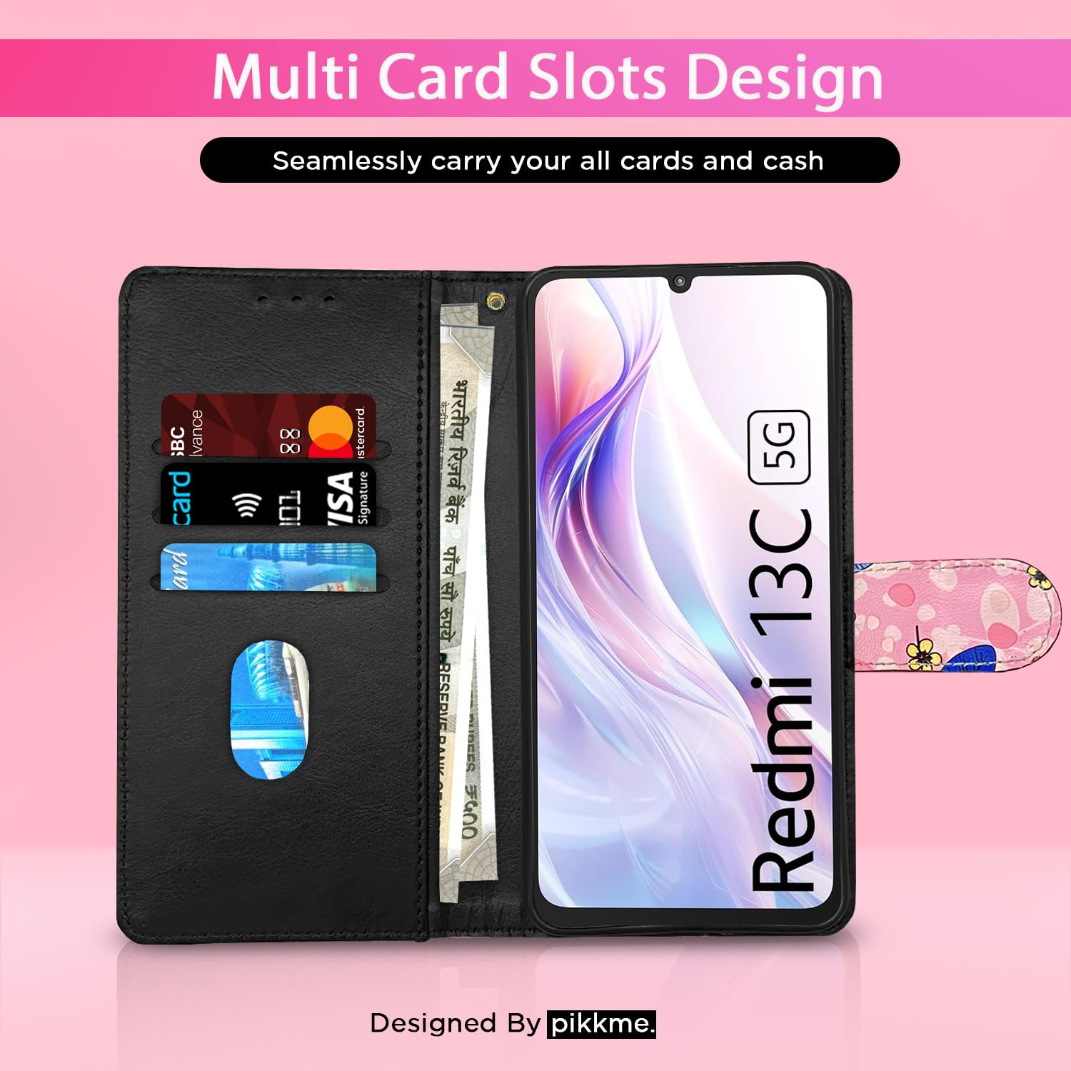 Pikkme Redmi 13C 5G Flip Cover for Girls Leather Finish | Inside TPU with Card Pockets | Wallet Stand and Shock Proof | Complete Protection Flip Case (Pink Flower)
