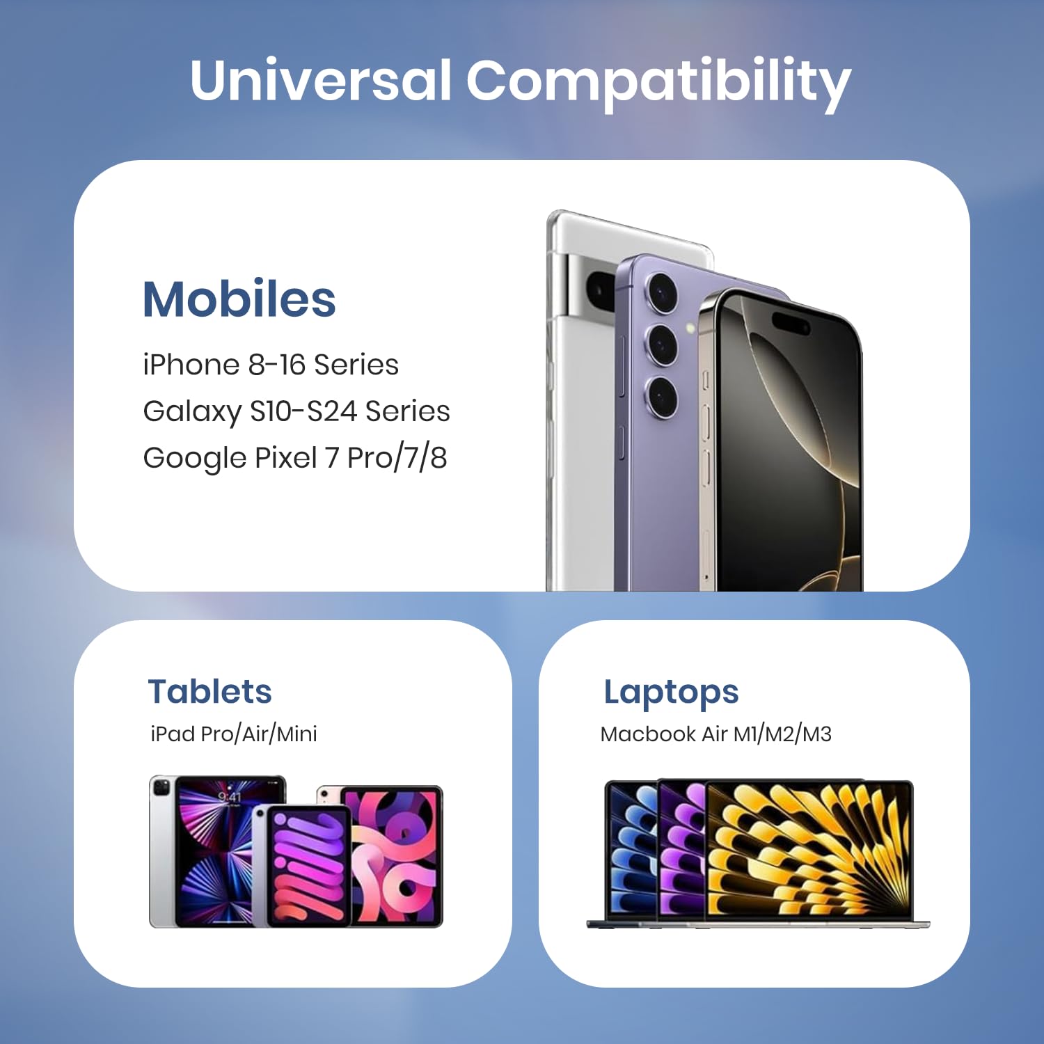 Universal Compatibility: Works with iPhone 16,15, 14, 13, 12, 11, iPad, AirPods, and MacBook Air, as well as other Type-C compatible devices.