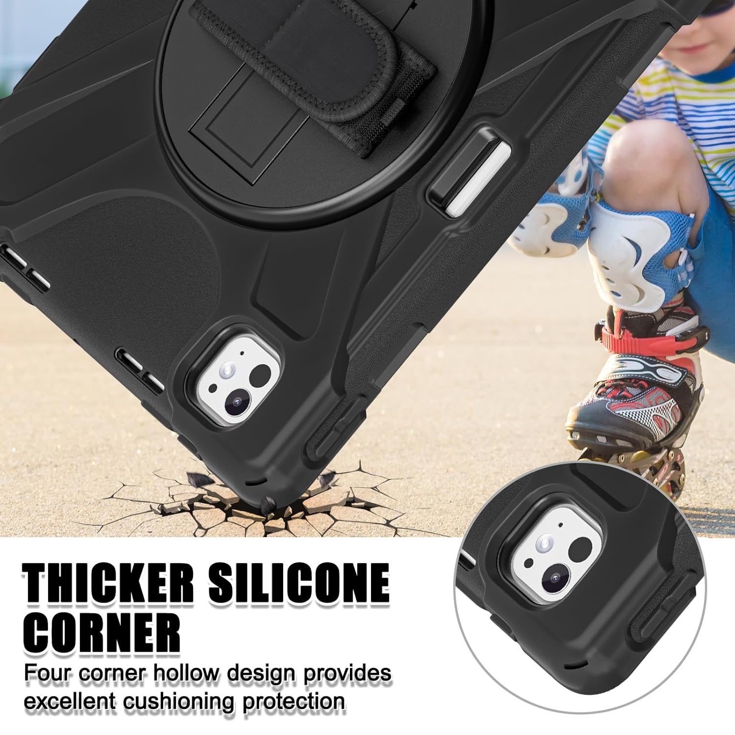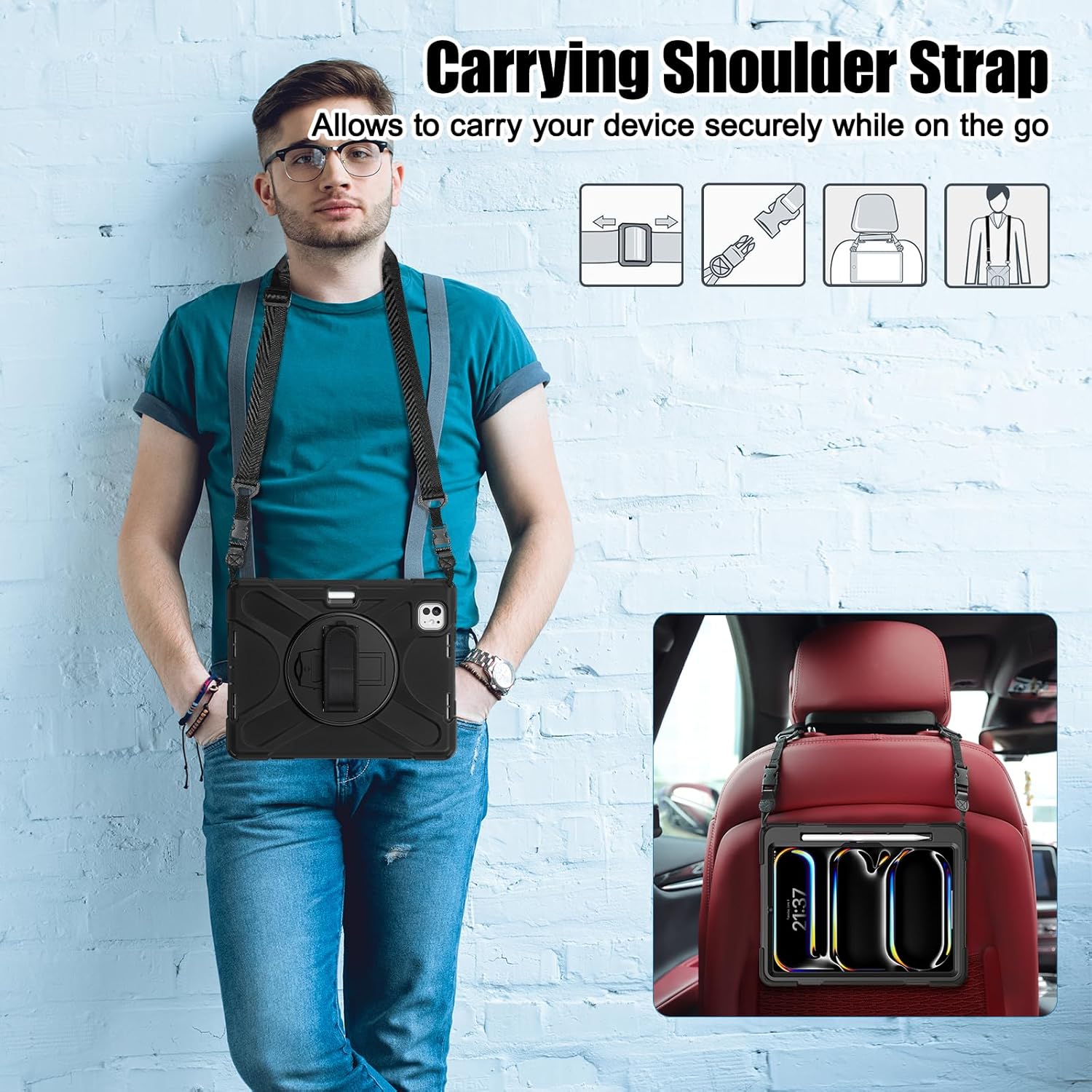 ProElite Cover for Apple iPad Pro 11 inch 2024 Case, Rugged 3 Layer Armor case Cover for iPad Pro 11 inch M4 2024 with Apple Pencil Holder, Shoulder Strap and Kickstand, Black