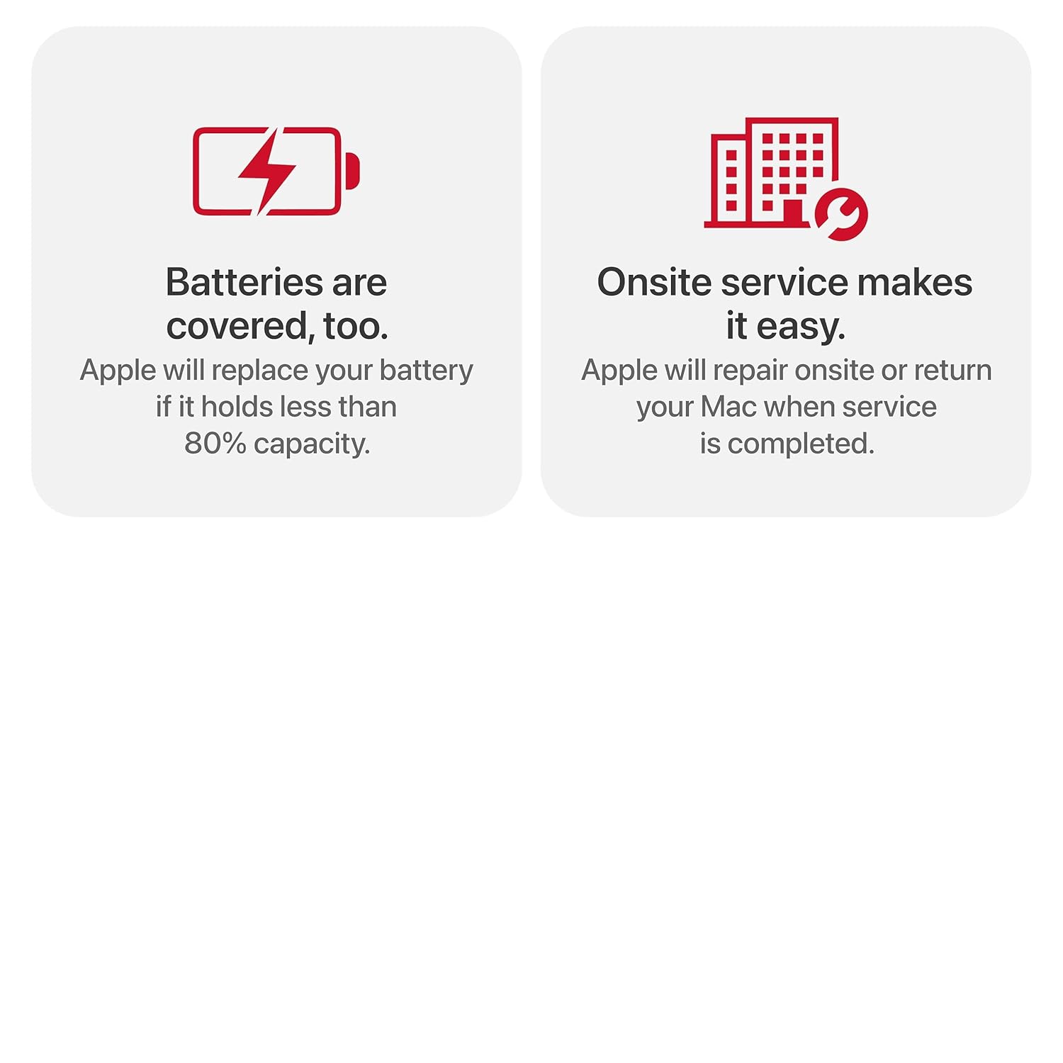 Protect+ with AppleCare Services for Mac includes service and support from Apple, with certified repairs at Apple Stores and Apple Authorized Service Providers using genuine Apple parts, and priority access to Apple Support.
