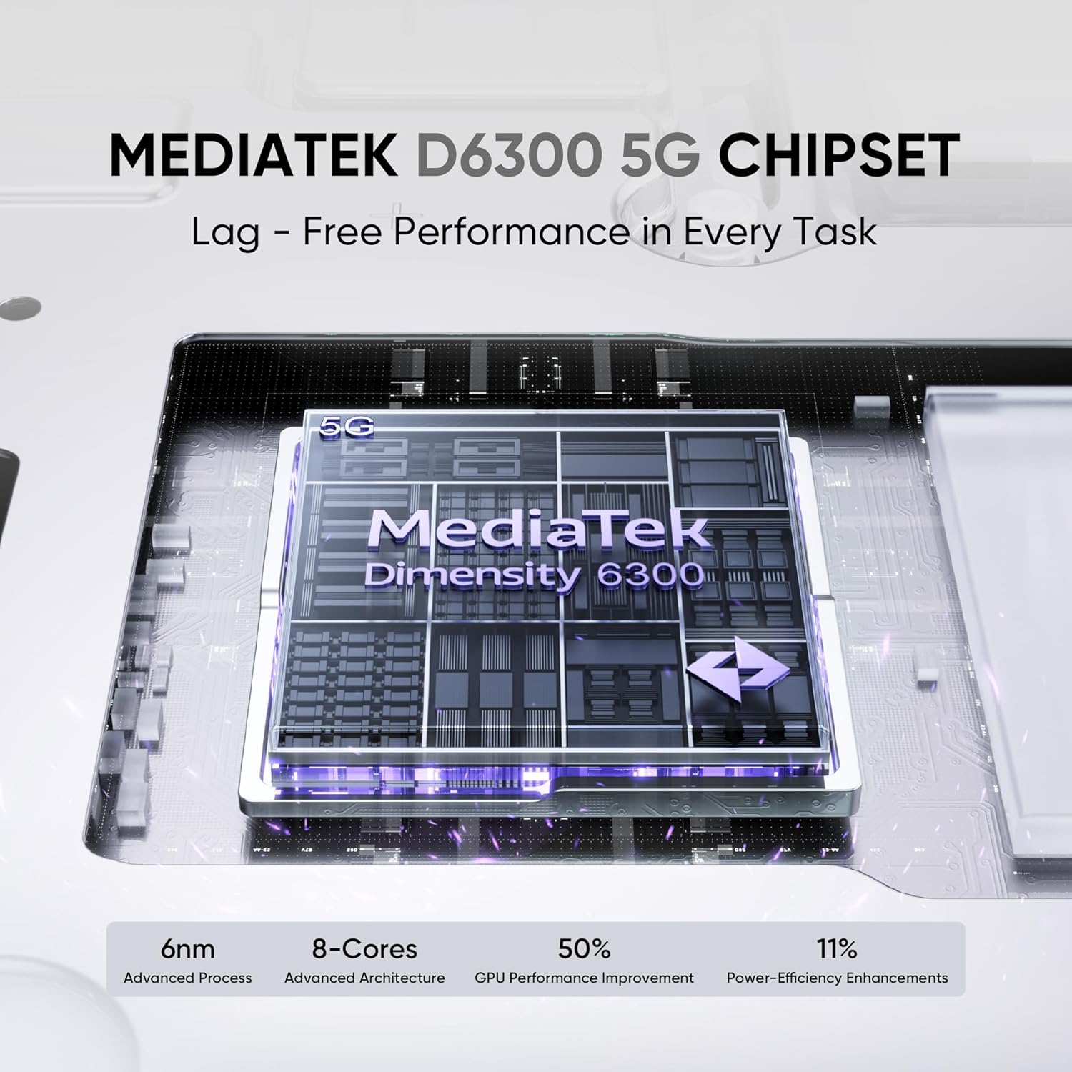 MediaTek Dimensity 6300 5G: Enjoy fast and reliable 5G connectivity with a power-efficient processor.