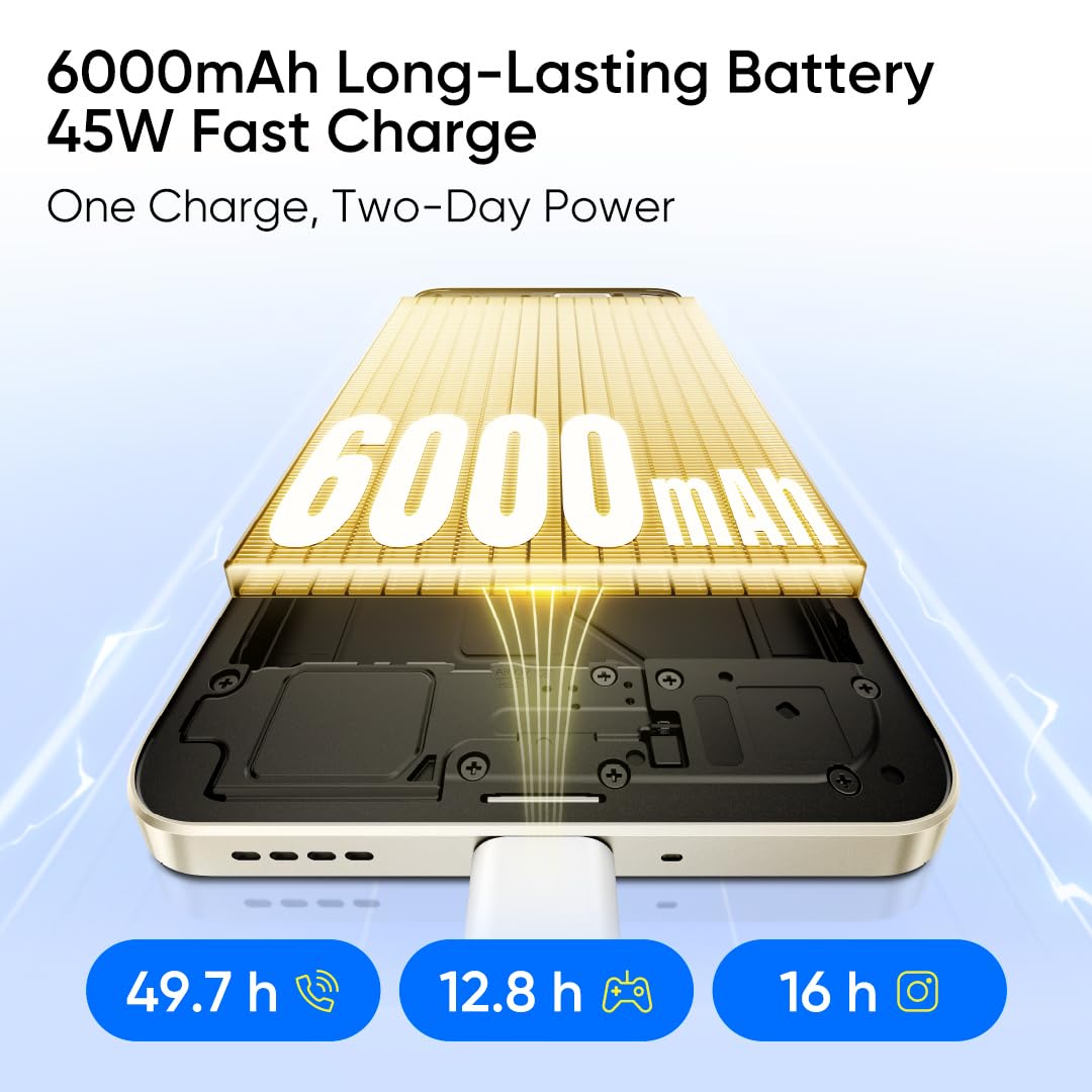 6000mAh Battery & 45W Fast Charge: All-day power with ultra-quick charging.