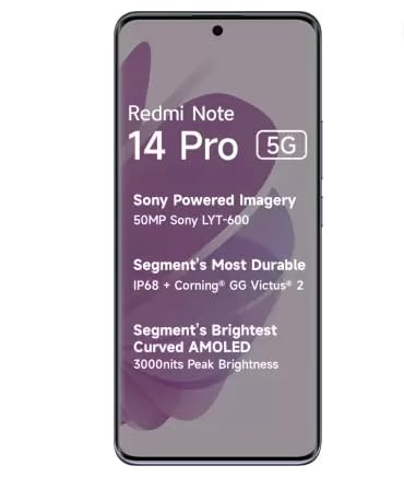 Redmi Note 14 Pro 5G Phantom Purple 8GB RAM 128GB Storage|50 MP Sony Camera Setup|Corning Gorilla Glass Victus 2 | 1.5K 3D Curved AMOLED | Mediatek Dimensity 7300- Ultra