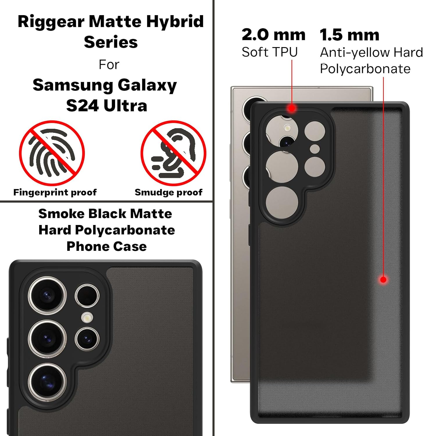 RIGGEAR Shockproof Sleek Hybrid Armor Smoke Black Matte Back Cover Case for Samsung Galaxy S24 Ultra 5G