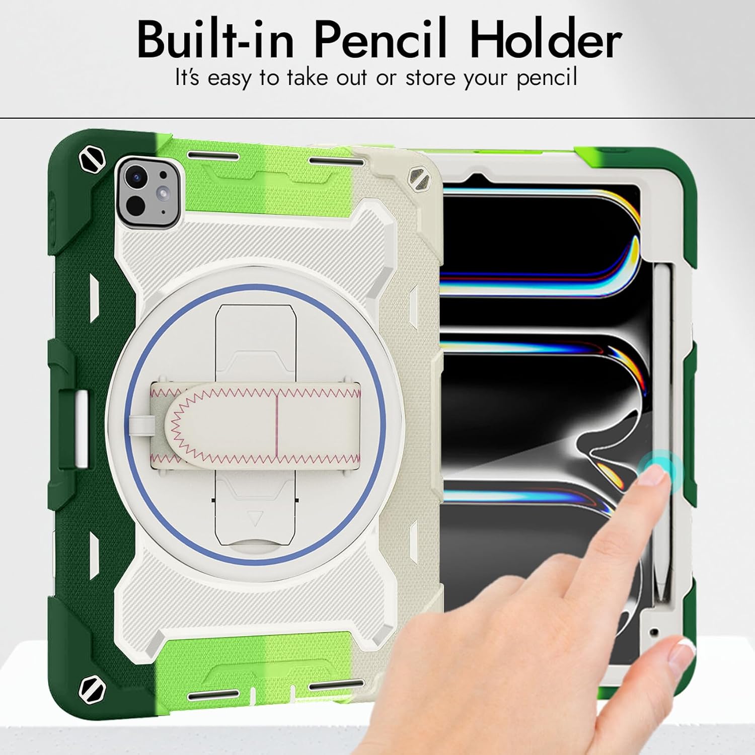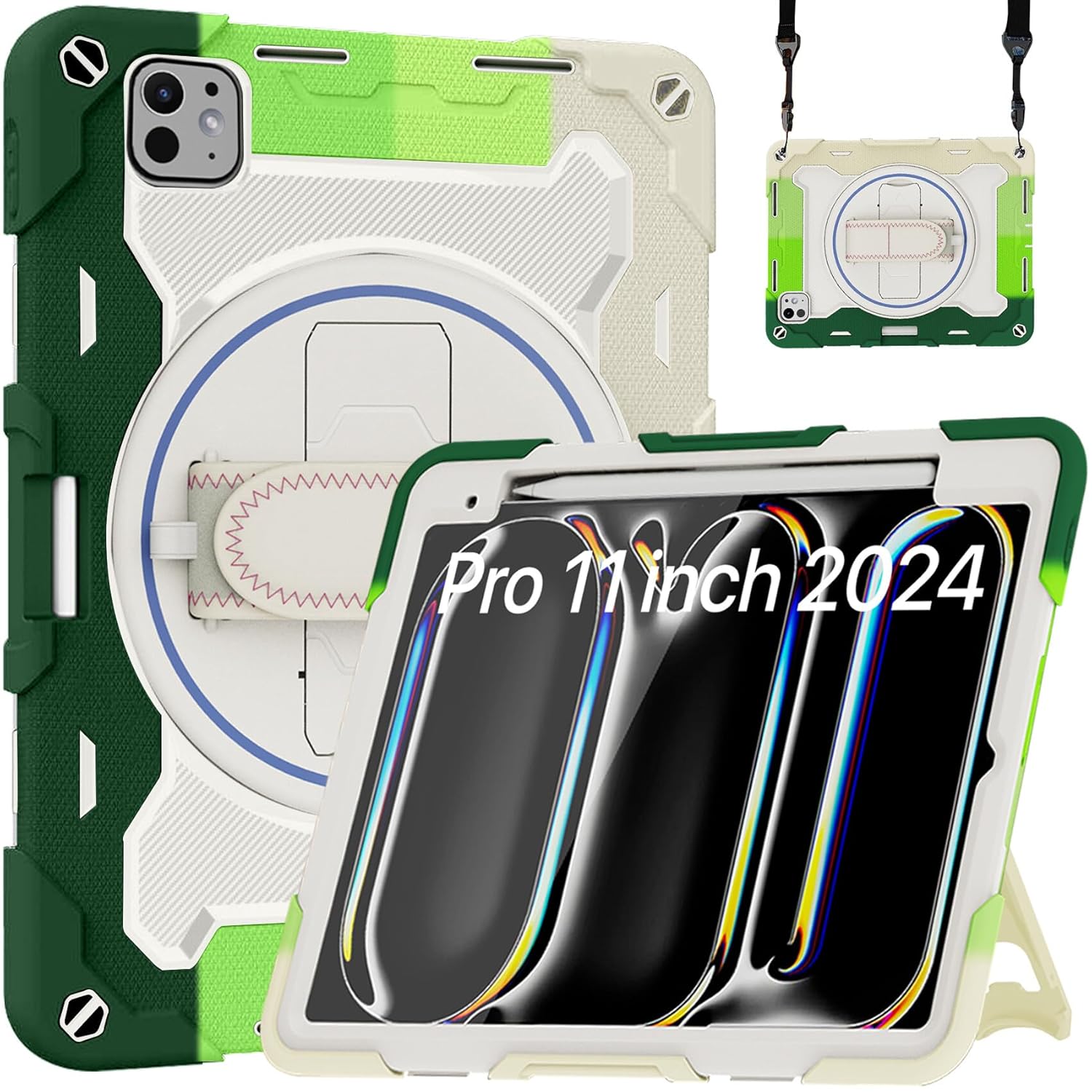 Robustrion for iPad Pro 11 inch M4 Cover Case with [Pencil Holder] Armor Shockproof Case with [Shoulder Strap] and [360 Degree Rotating Hand Strap] for iPad Pro 11 inch M4 2024 – Rainbow Green