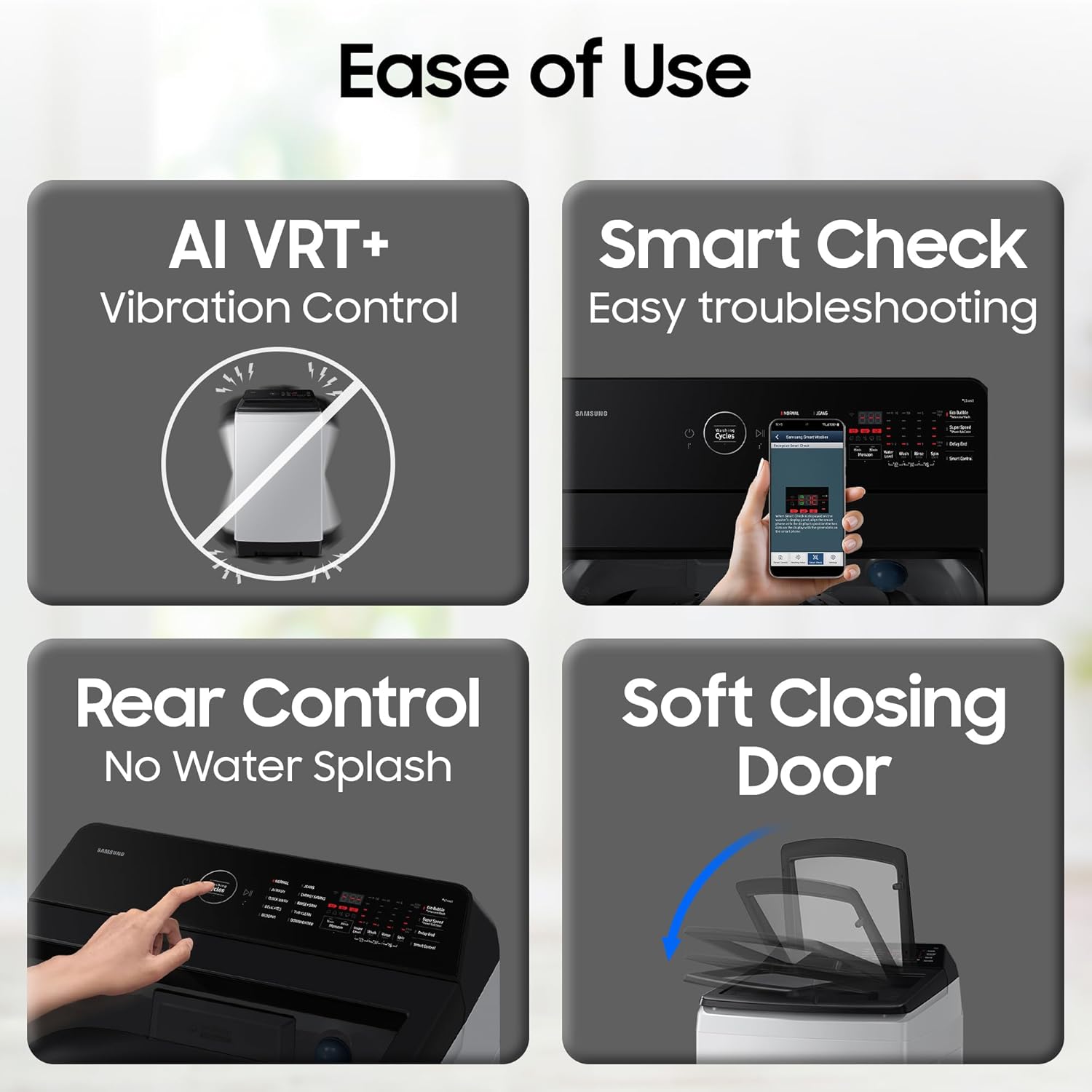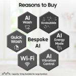 AI Wash – senses the weight and softness of the fabric in a load and enable 25% more fabric care | AI Energy Mode for up to 20% energy savings | AI VRT+ – Vibration Reduction Technology and wash clothes quietly | Ecobubble with DIT gets clothes clean using up to 25% less energy | BubbleStorm | Dual Storm | Auto Restart | Child Lock | Delay End | Drum type: 2nd Diamond | Intensive Wash | Magic Filter | Monsoon | Motor: DIT | Pulsator: PP Dual Storm | Spin Speed: 700 rpm | Smart Control | SmartThings | Smart Check | Soft Closing Door | Water Level: 10 Levels