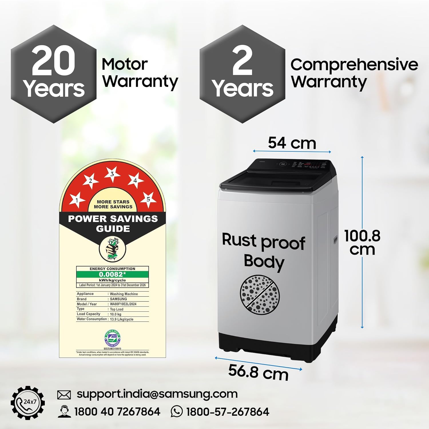 Capacity 10 kg: Suitable for large families | Water Pressure: (0.05 – 0.78 Mpa(0.5 – 8.0) (kg.f/cm²) | Water Consumption : Refer to BEE label