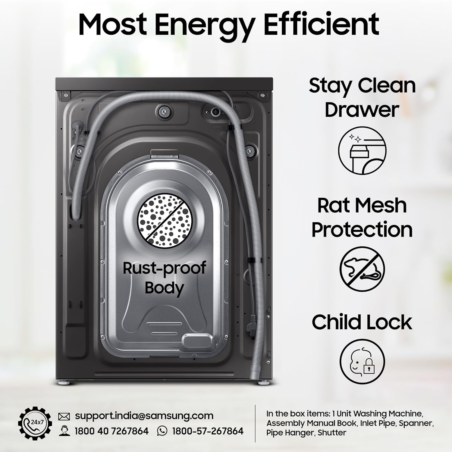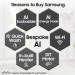 Key Performance Features: AI Ecobubble with 45% better fabric care| AI Energy Mode for up to 70% energy savings | AI Touch Control | Wi-Fi Embedded – Operate remotely| Smartthings for home integration| Hygiene Steam| Super Speed – Wash is just 39 minutes | SpaceMax – Creates more space inside to incorporate a larger drum| Quick Wash| Bubble Soak| Drum Clean+ Removes dirt and 99.9% of odor-causing bacteria| Pre Wash| In-built Heater for Hot & Cold wash