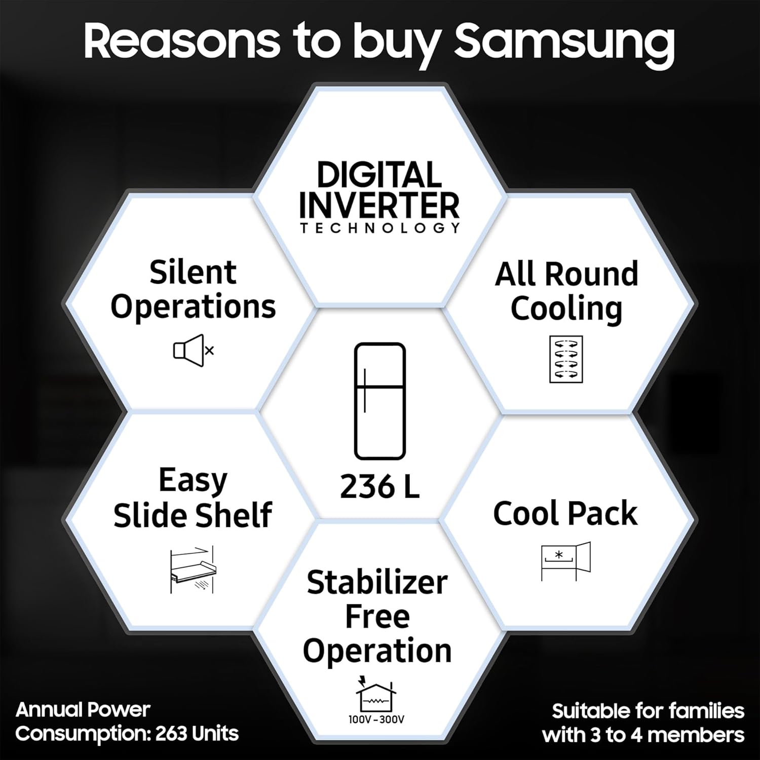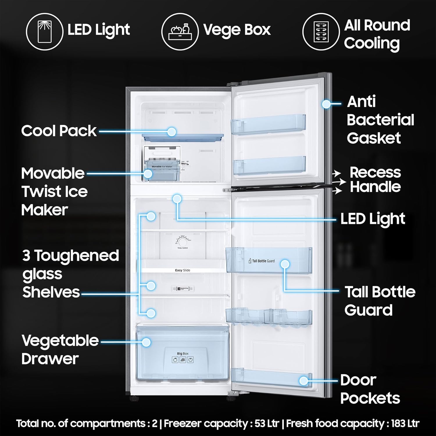 Samsung 236 L, 2 Star, Digital Inverter, Frost Free Double Door Refrigerator (RT28C3032GS/HL, Gray Silver)