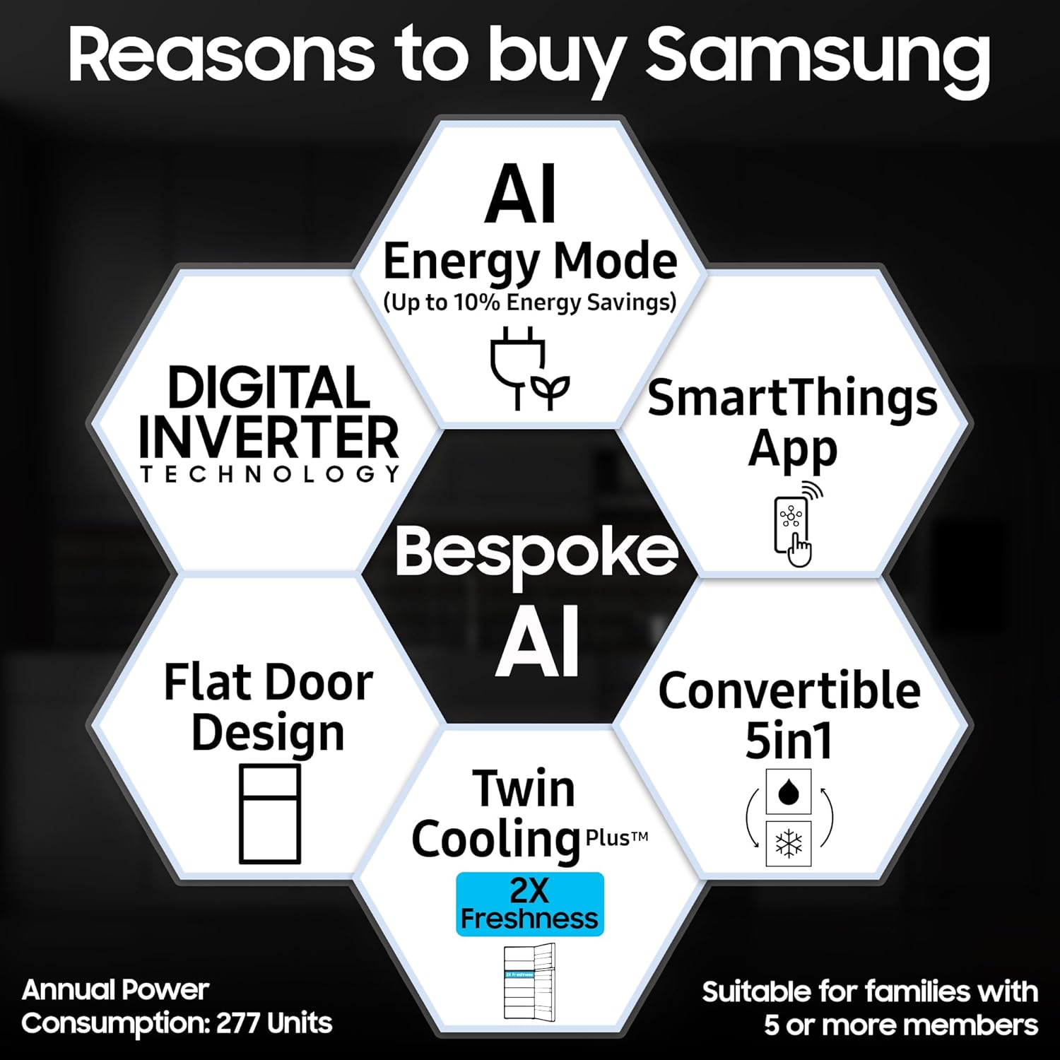 Samsung Exclusive Features : AI Energy Mode | Control with your Phone | SmartThings | Convertible 5-in-1 | Twin Cooling Plus | Fresh Room | Power Freeze | Power Cool