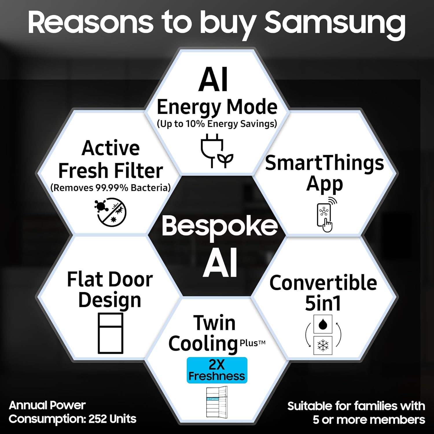 Samsung Exclusive Features : AI Energy Mode | Control with your Phone | SmartThings | Convertible 5-in-1 | Twin Cooling Plus | Active Fresh Filter | Fresh Room | Power Freeze | Power Cool