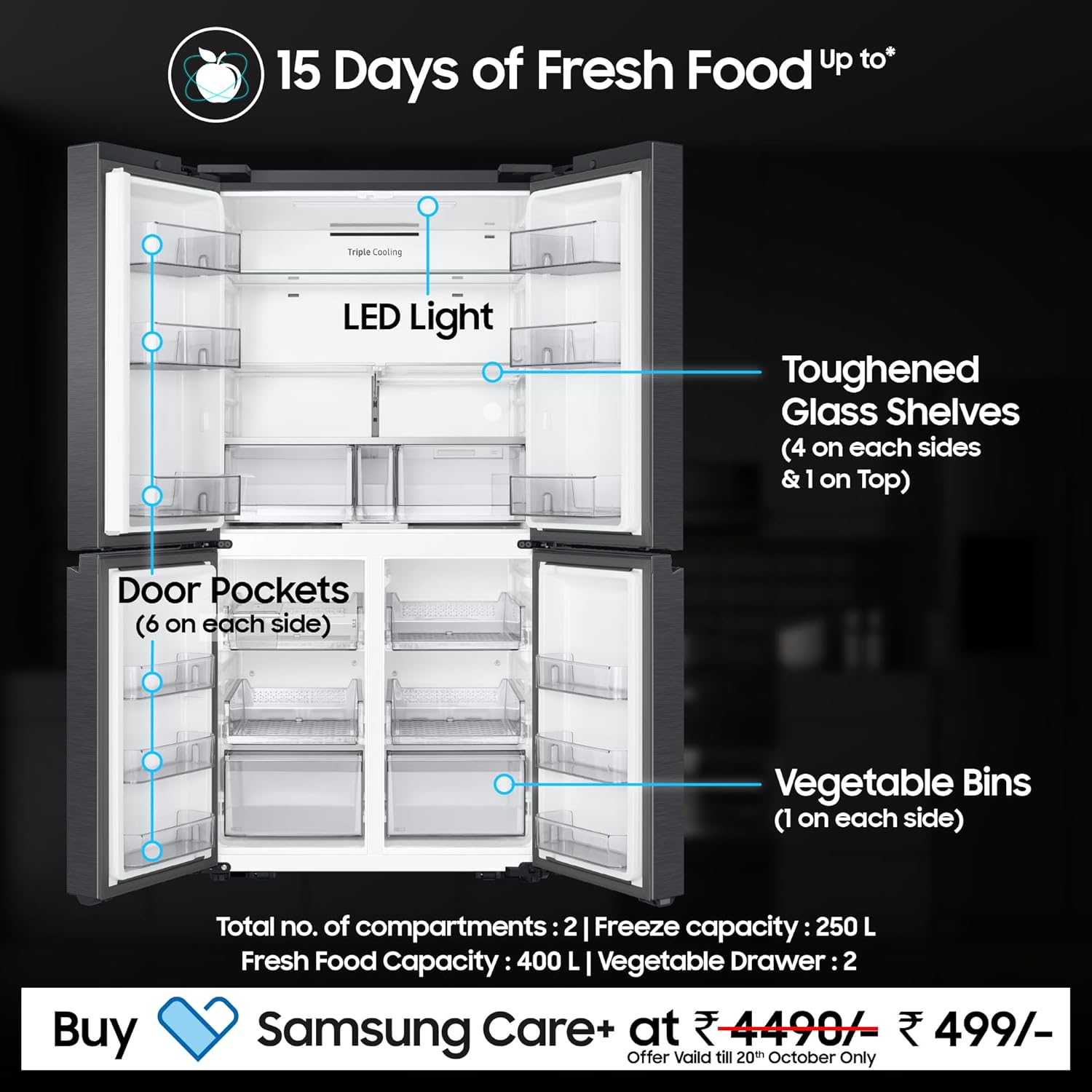 Triple Cooling System & Metal Cooling – Advanced Triple Cooling ensures independent temperature control for the fridge, freezer, and convertible compartments, preventing odor mixing while keeping food fresh for longer. The Metal Cooling plate retains cold air even when the door is frequently opened.