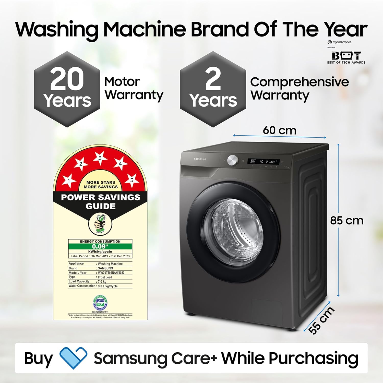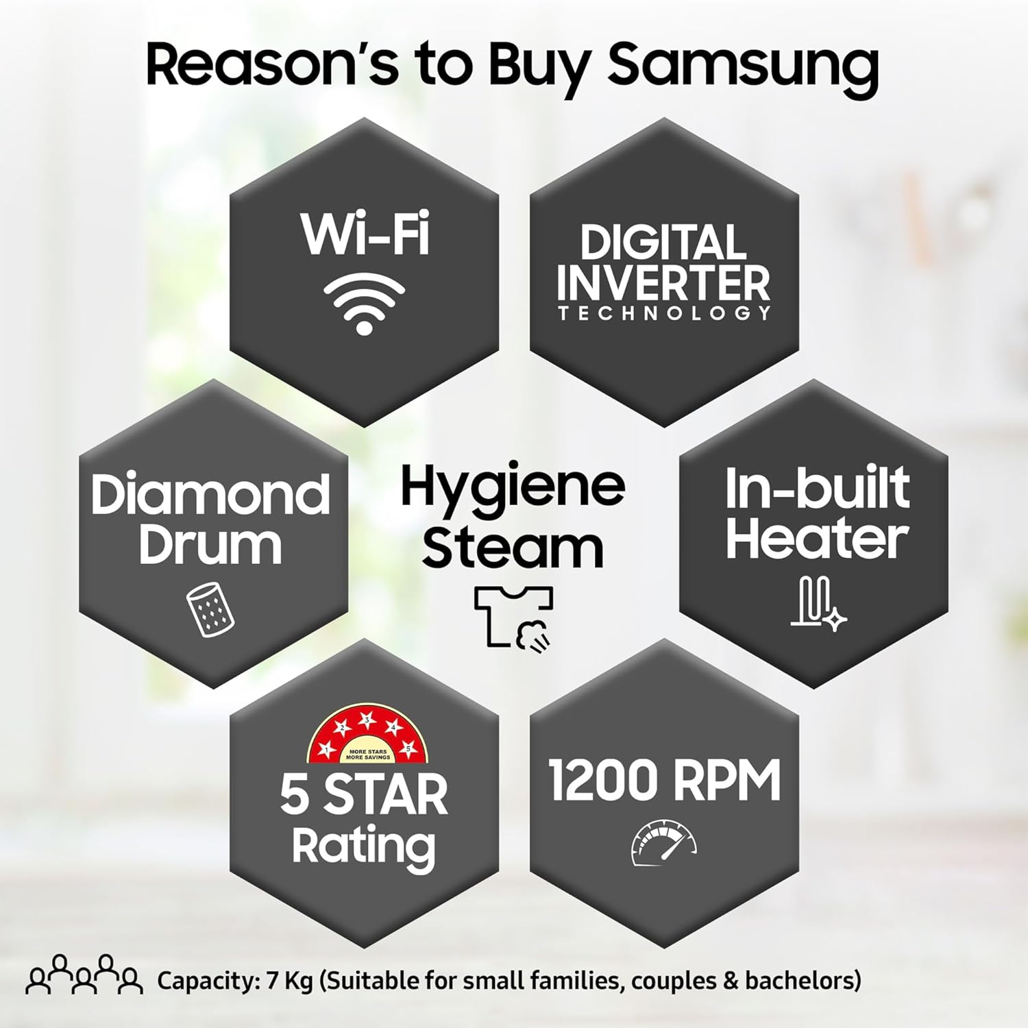 Capacity 7 kg: Suitable for 3 – 4 members | Water Pressure: (50-800 KPa) | Water Consumption : Refer to BEE label