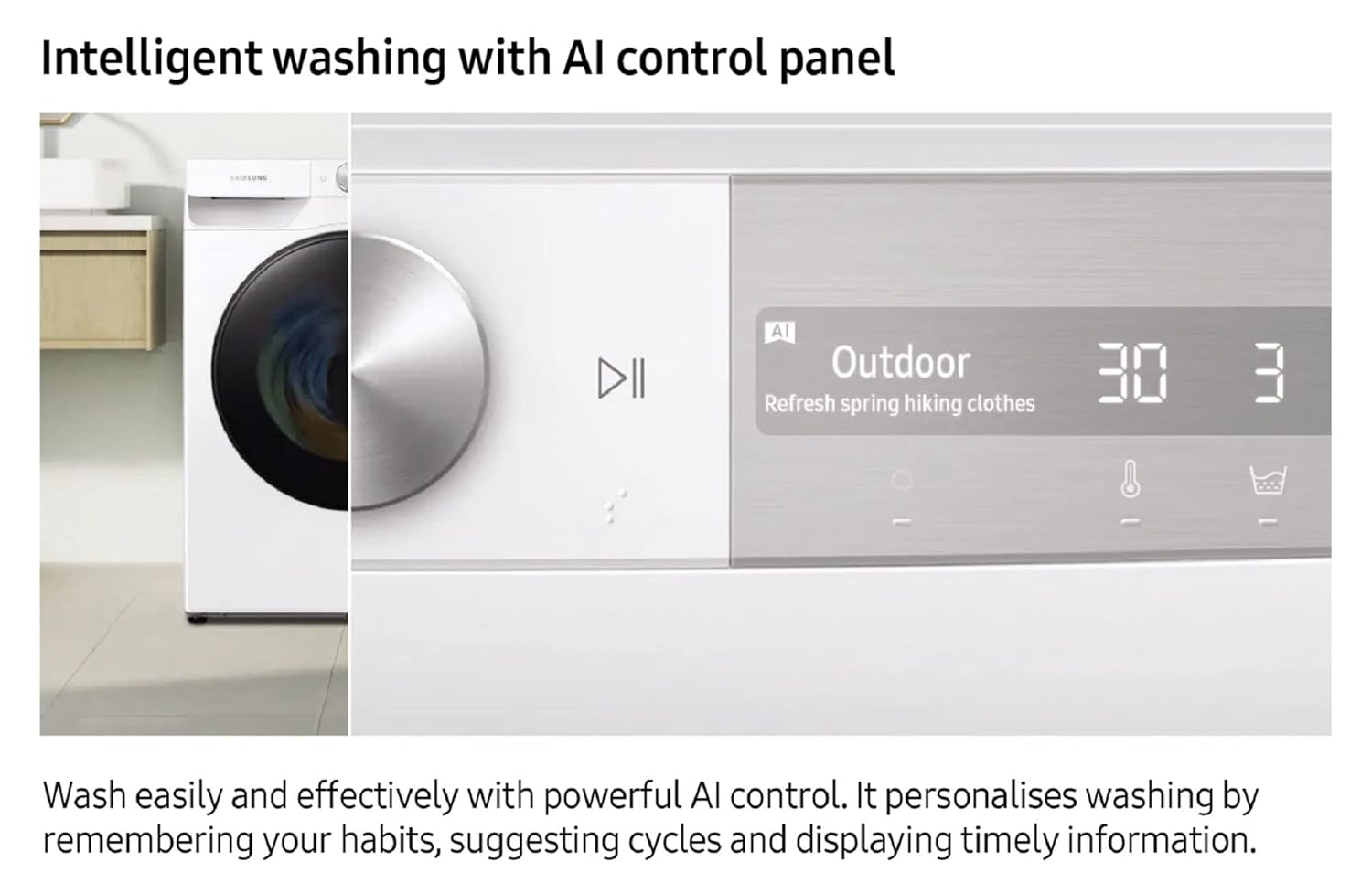 Panel Display : AI Control Panel : Intuitive interface with Easy to use Jog Dial. The AI Control Panel is a simple UX based intelligent laundry solution for optimizing laundry cycles, energy savings and smart home integration.