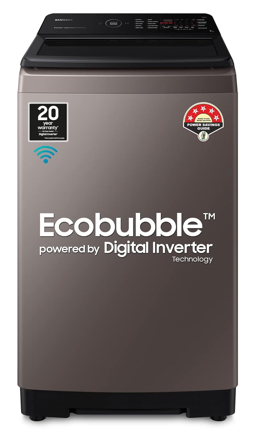 Samsung 7 Kg ‘5 Star Ecobubble™ Wi-Fi, Inverter Fully Automatic Top Load Washing Machine (WA70BG4542BYTL_Lavender Gray), Bubble Storm technology