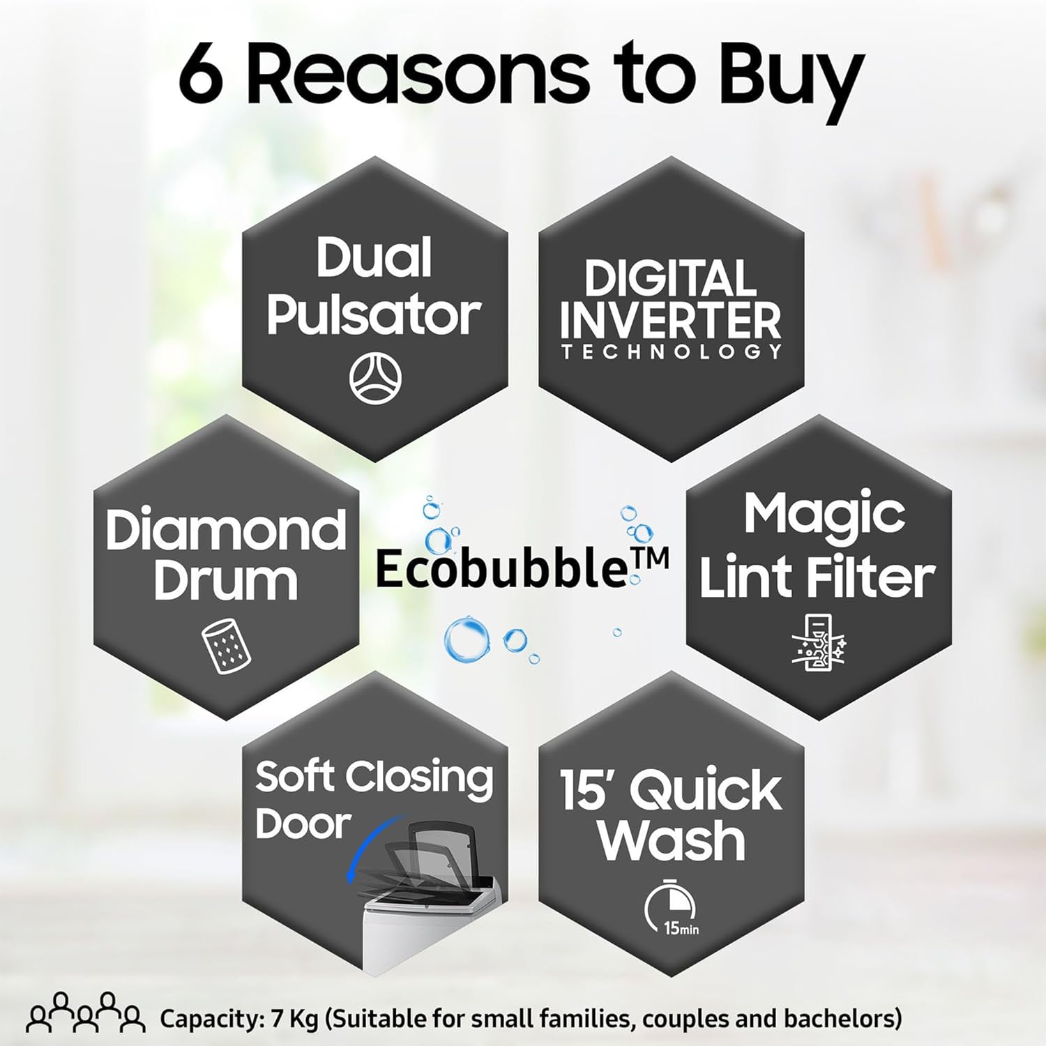 Capacity 7 kg: Suitable for 3 – 4 members | Water Pressure: (0.01-0.78 Mpa(01-8.0kg.f/cm²) | Water Consumption : Refer to BEE label