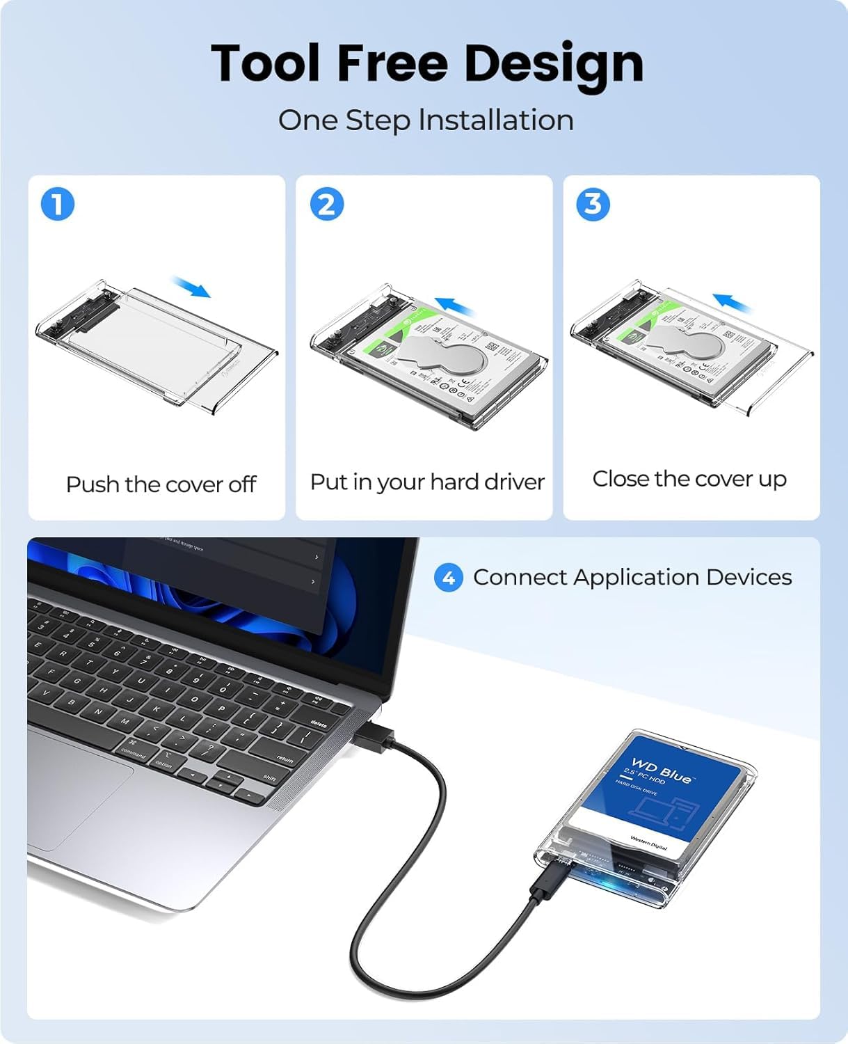 【Durable Construction】: Crafted from high-quality PC board, this external hard drive enclosure offers anti-shock properties, providing robust protection for your hard drive while allowing easy monitoring of its working status without the need to open the enclosure cover.