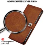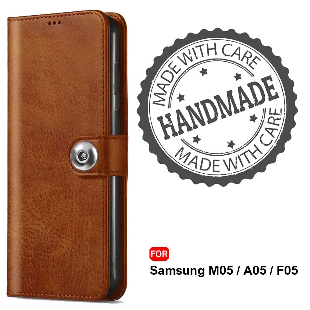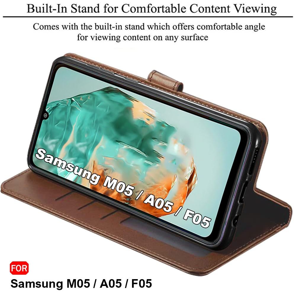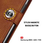 TheGiftKart Flip Cover Back Case for Samsung Galaxy M05 / A05 / F05 | Genuine Leather Finish | Designer Button | Inbuilt Pockets & Stand | Flip Cover for Samsung M05 / A05 / F05 (Faux Leather, Brown)