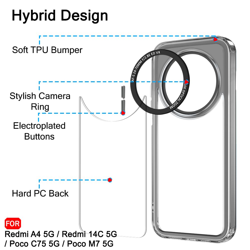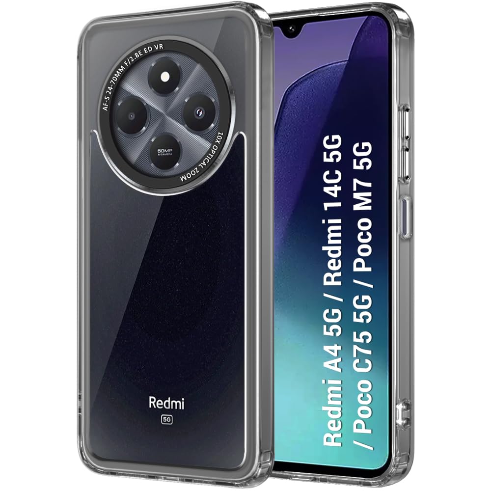TheGiftKart Hybrid ShockProof Back Cover Case for Mi Redmi A4 5G / Redmi 14C 5G / Poco C75 5G / Poco M7 5G | Stylish Camera Border | Plated Buttons | Crystal Clear Hard Cover (TPU & PC, Smoked Bumper)