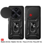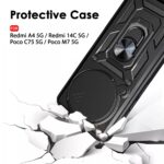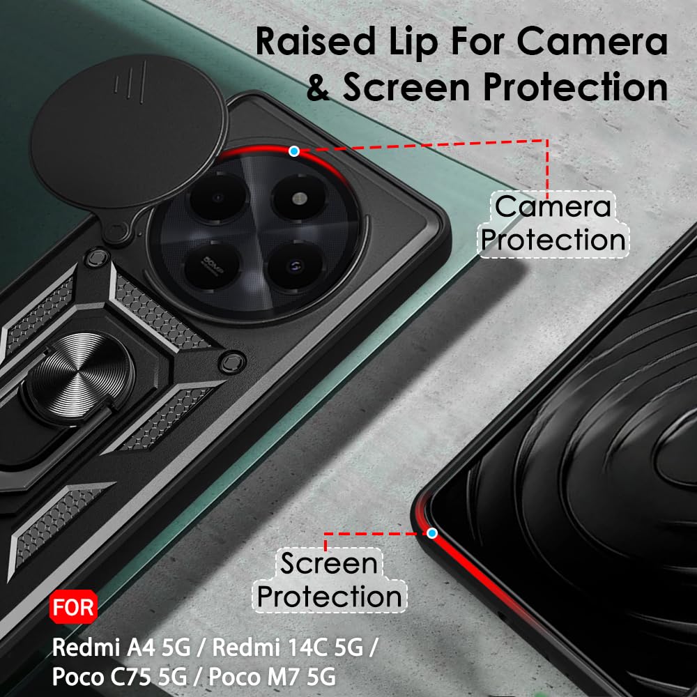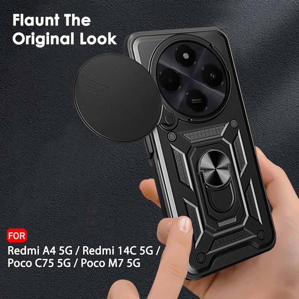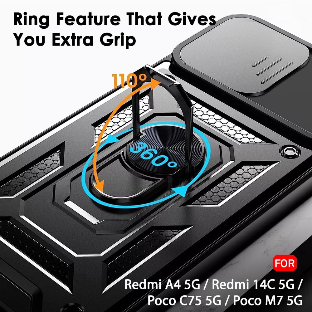 TheGiftKart Tough Armor Bumper Back Cover Case for Mi Redmi A4 5G / Redmi 14C 5G / Poco C75 5G / Poco M7 5G | Rotating Camera Cover, Kickstand & Ring Holder | 360° Protection Cover (PC & TPU, Black)