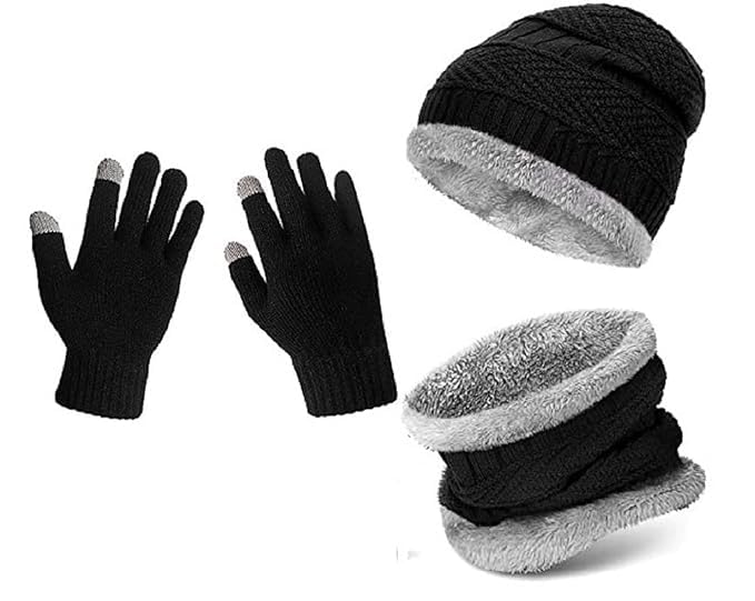 TRUFLAIR Winter Thick Fleece Lined Beanie Woolen Cap Hat, Neck Scarf and Touchscreen Gloves Set Cap for Men Women(3 Set) Black