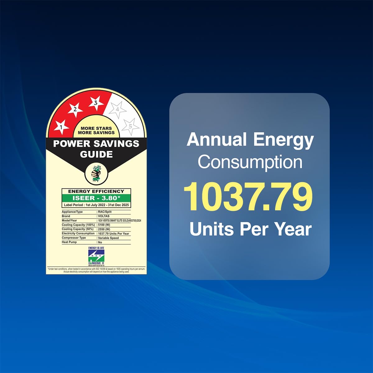 Energy Rating: 3 Star | Energy efficiency | Annual Energy Consumption (as per energy label): 1037.79 Watts | ISEER Value: 3.80