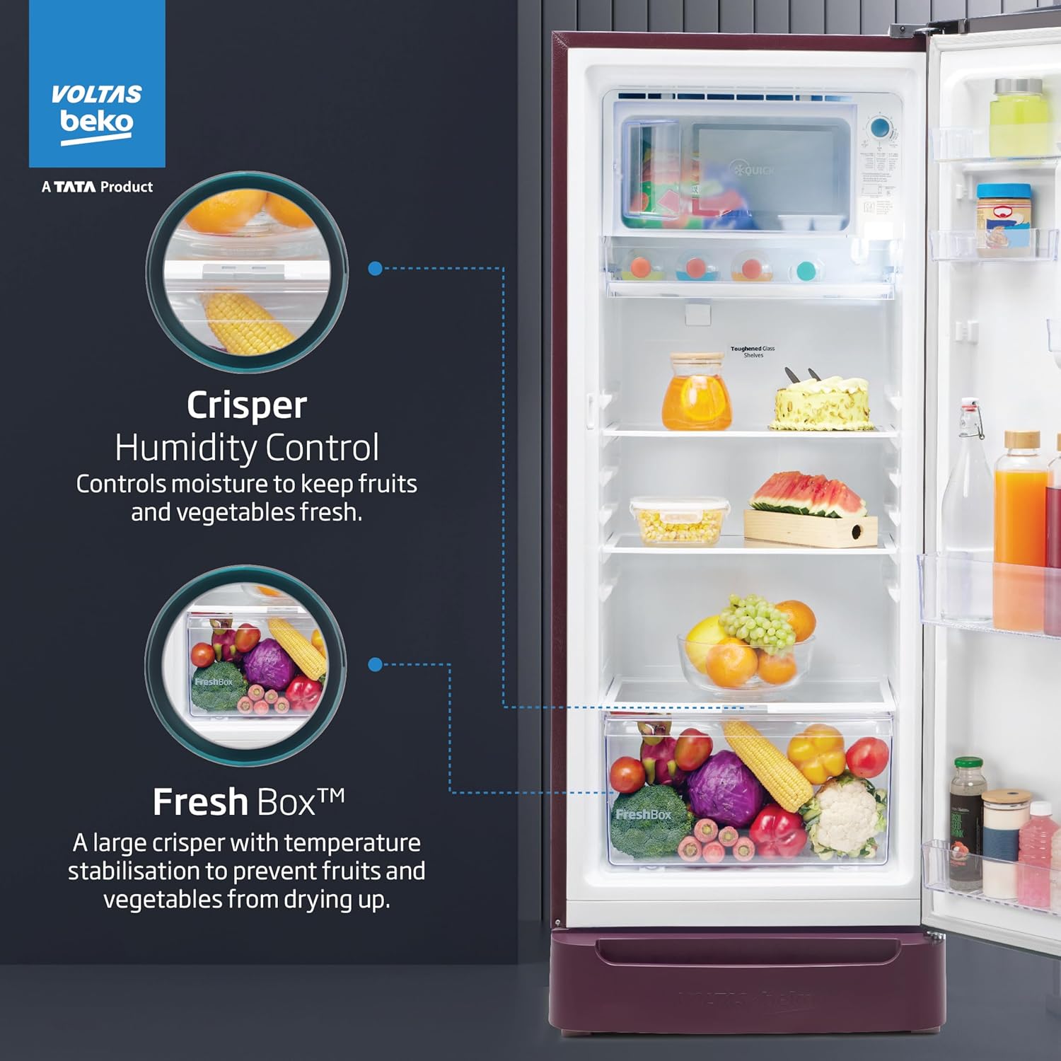 Voltas Beko, A Tata Product 183 L 5 Star Direct Cool Single Door Refrigerator (, RDC215A / W0VWR0M0B00GO, Vivi Wine, Base Drawer)