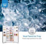The dual twist ice tray allows for easy and quick ice removal with a simple twist. It ensures consistent ice cube formation and provides a convenient way to serve ice. The tray’s design prevents spills and messes during the ice-making process.