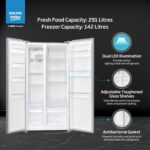 Storage or Interior Description : Fresh food capacity: 291 ltrs, Frezzer Capacity: 142 ltrs, Number of Compartments: 2, Drawers: 4, Shelves: 8, Shelf type : Spill proff adjustable toughened glass shelves, Anti bacterial gasket, 2 ltrs bottle storage, Dual twist Ice tray, Dual LED Illumination