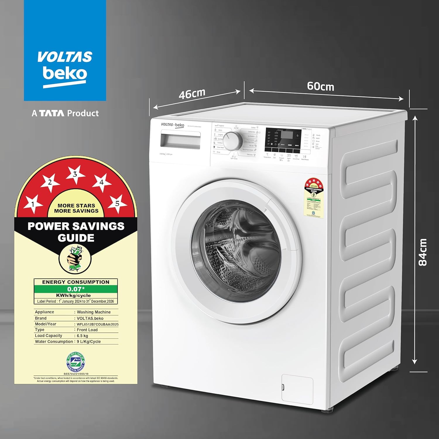 Voltas Beko, A Tata Product 6.5 KG 5 Star Fully Automatic Front Load Washing Machine with Hygiene wash (WFL6512B7COUBAA/WWV, White)
