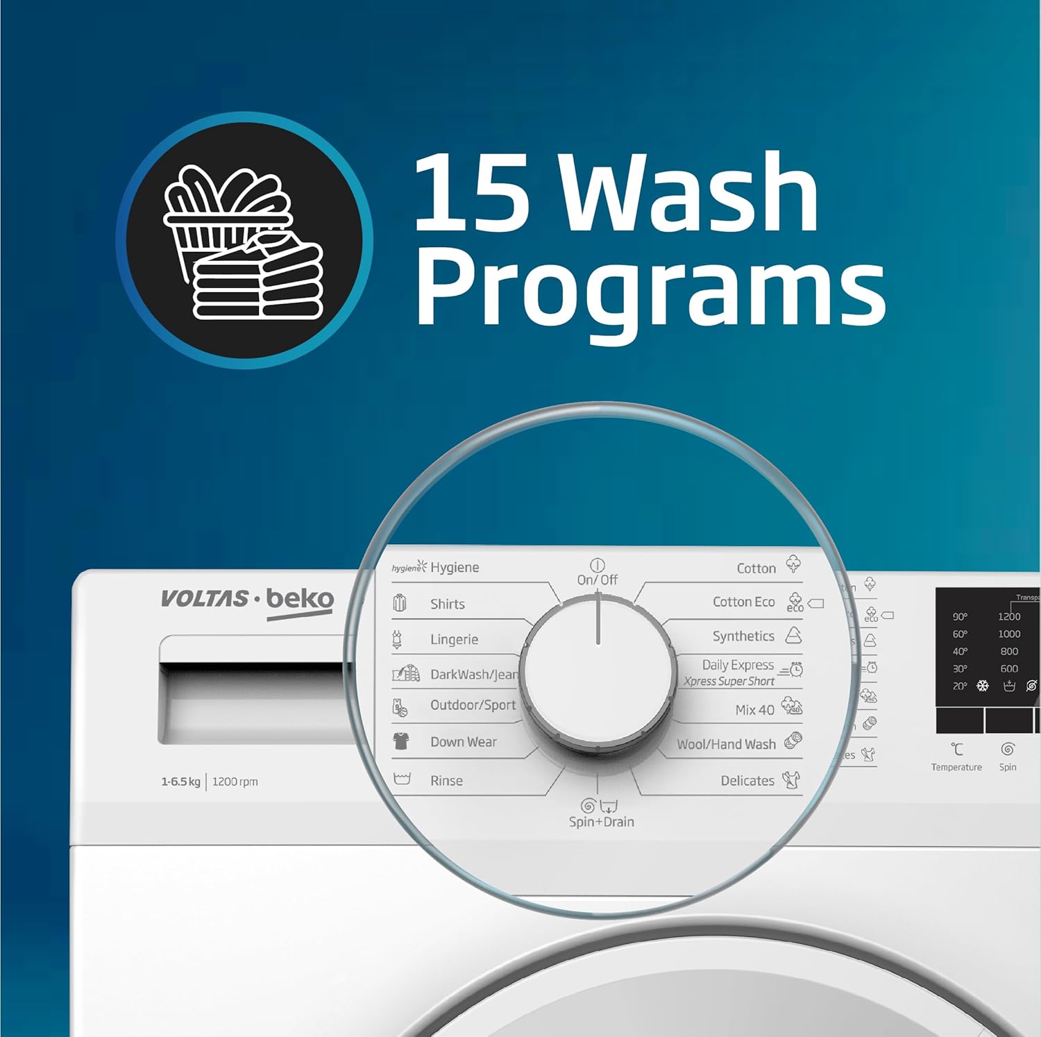 15 Wash Programs: Hygiene+ Cleans clothes thoroughly for hygiene and freshness I Daily Express; Express super shot I Shirts I lingerie I Dark wash/Jeans I Outdoor/sports I Down wear I Rinse I Spin + Drain I Delicates I Wool/Hand wash I Mix 40 I Synthetics I Cotton I Cotton Eco