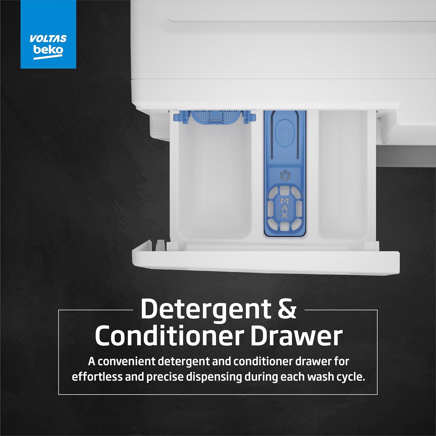 The Voltas Beko fully automatic front load washing machine combines style and functionality with its sleek design and advanced features. It boasts an inbuilt heater for effective stain removal, a hygiene wash for superior cleanliness, and an express wash that completes in just 14 minutes. With 15 versatile wash programs, it caters to all your laundry needs, ensuring your clothes are impeccably clean and fresh every time.