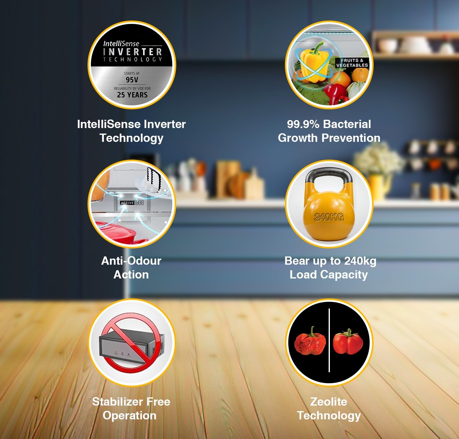 Special Features: Touch UI Inside Refrigerator, Get Ice In Up 85 Minutes, 40% Faster Bottle Cooling, Anti-Odour Action, Coldest Freezer As -24C, 99.9% Bacterial Growth Prevention