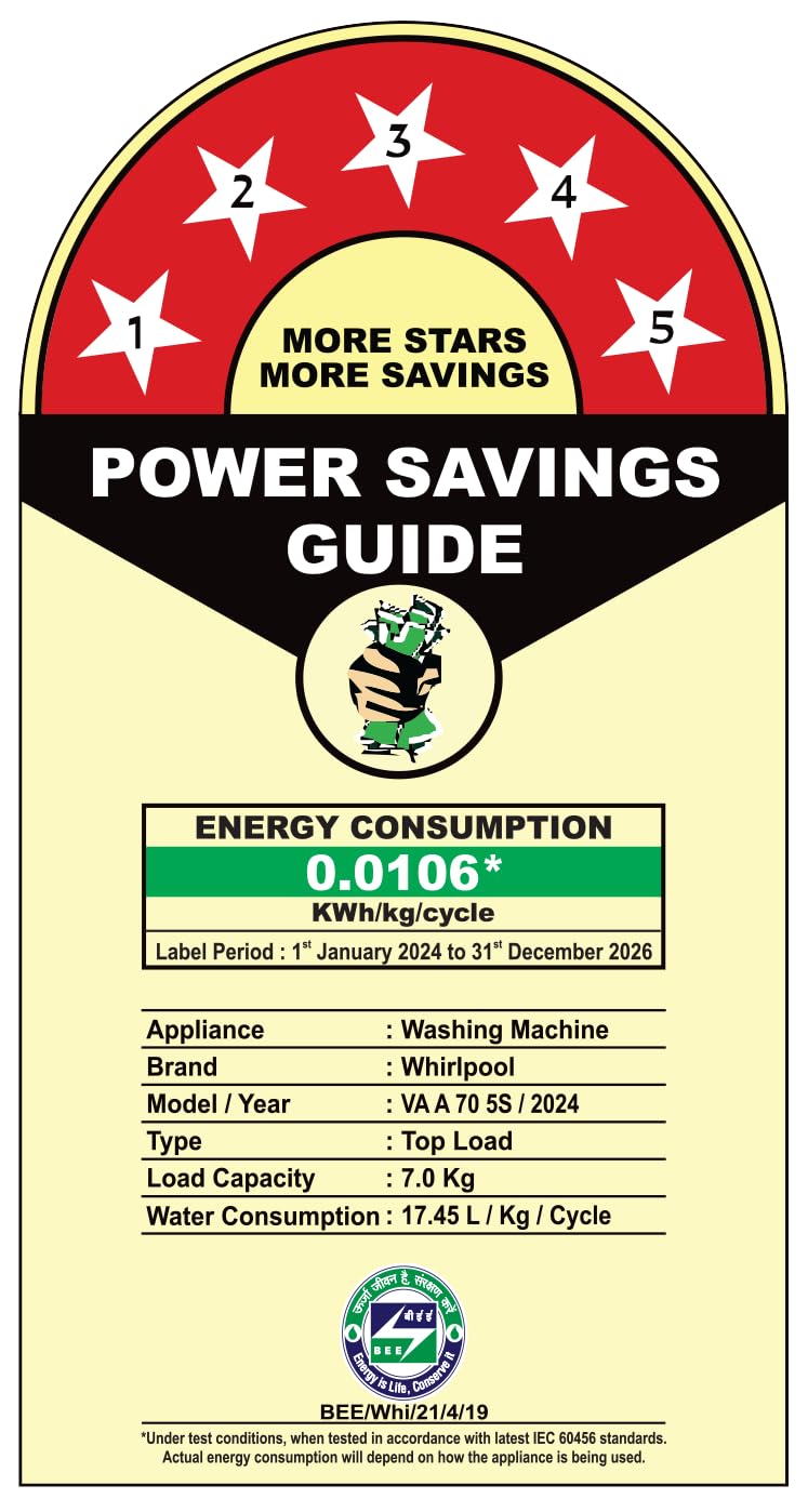 Energy star rating 5 Star: Best in class efficiency, Annual Energy Consumption : 0.0106 KWh/Kg/cycle