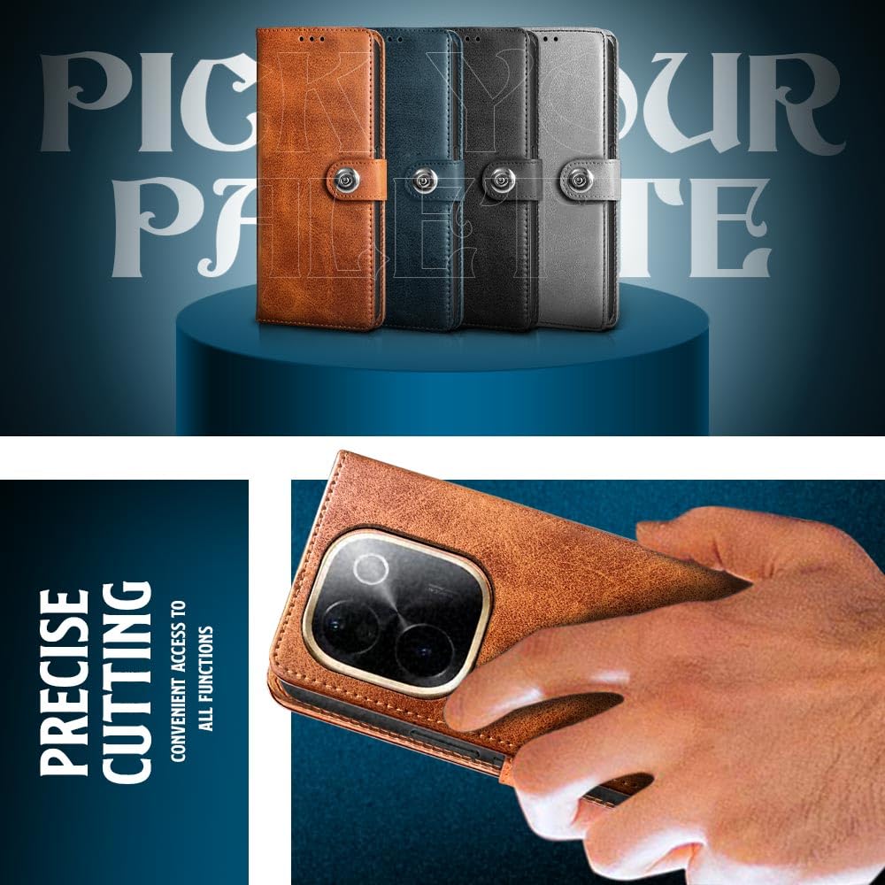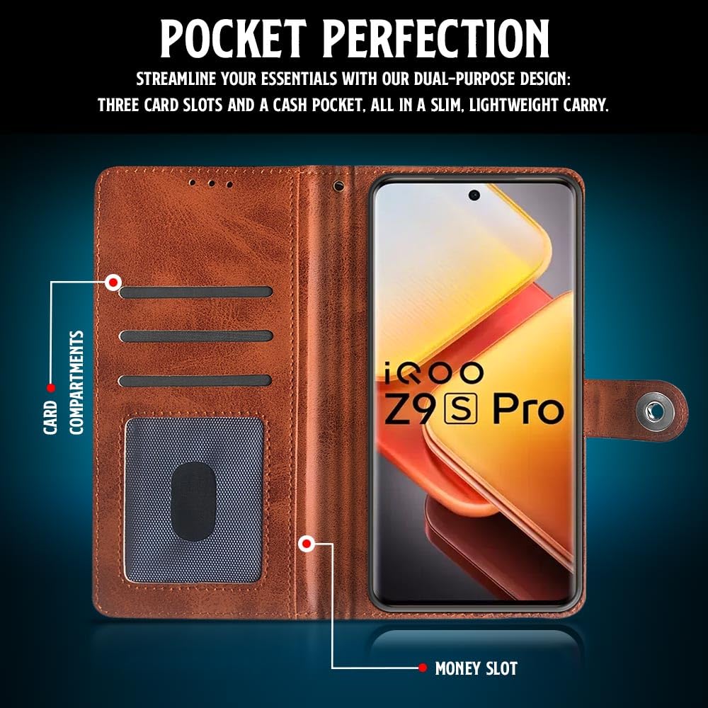 WOW IMAGINE Shock Proof Flip Cover Back Case for iQOO Z9s Pro 5G | Vivo T3 Pro 5G (Magnetic Button Flip Case | Wallet Pockets & Stand | Leather Finish | Alder Brown)