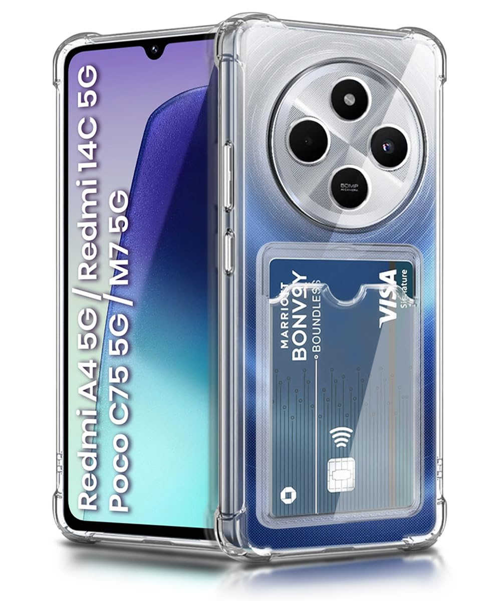 WOW IMAGINE Transparent Back Cover Case for Redmi A4 5G | Poco C75 | 14C 5G | Poco M7 | Flexible Built-in Card Pockets Wallet | 360° Camera Protection TPU | Soft Silicone Mobile Cover – Transparent