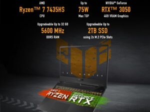 ASUS TUF Gaming A15, AMD Ryzen 7 7435HS, NVIDIA GeForce RTX 3050, 16GB RAM, 1TB SSD, FHD 144Hz 250 nits, 15.6″, Windows 11, Black, 2.30KG, FA566NCR-HN117W Gaming Laptop