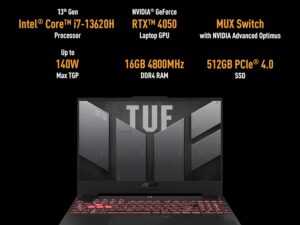 ASUS TUF F15 13th Gen, Intel Core i7-13620H Gaming Laptop(NVIDIA RTX 4060-8GB/140W TGP/16GB RAM/512GB SSD/FHD/15.6″/144Hz/RGB KB/90Whr/Windows 11/Mecha Gray/2.20kg) FX507VV-LP287W