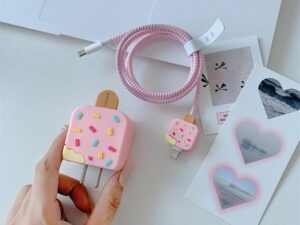 AUGEN Cartoon 3D Design Protective Case for 20W iPhone USB-C Power Adapter Charger, Cute Cartoon Lightning Data Cable Case for iPhone Charger (Ice Cream Pink, Pack of 1)