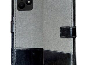 Coverage Dual Colour Joint Denim Cloth & Vegan Leather Magnetic Case Cover with Card & Cash Wallet Flip Cover Compatible for Realme Narzo N61 – Grey & Black