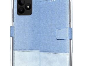 Coverage Dual Colour Joint Denim Cloth & Vegan Leather Magnetic Case Cover with Card & Cash Wallet Flip Cover Compatible for Realme Narzo N61 – Royal & Sky Blue