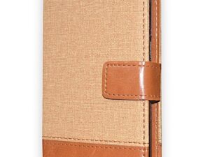 COVERBLACK Dual Colour Joint Denim Cloth & Vegan Leather Magnetic Case Cover with Card & Cash Wallet Flip Cover Compatible for Realme Narzo N61 – Beige & Brown